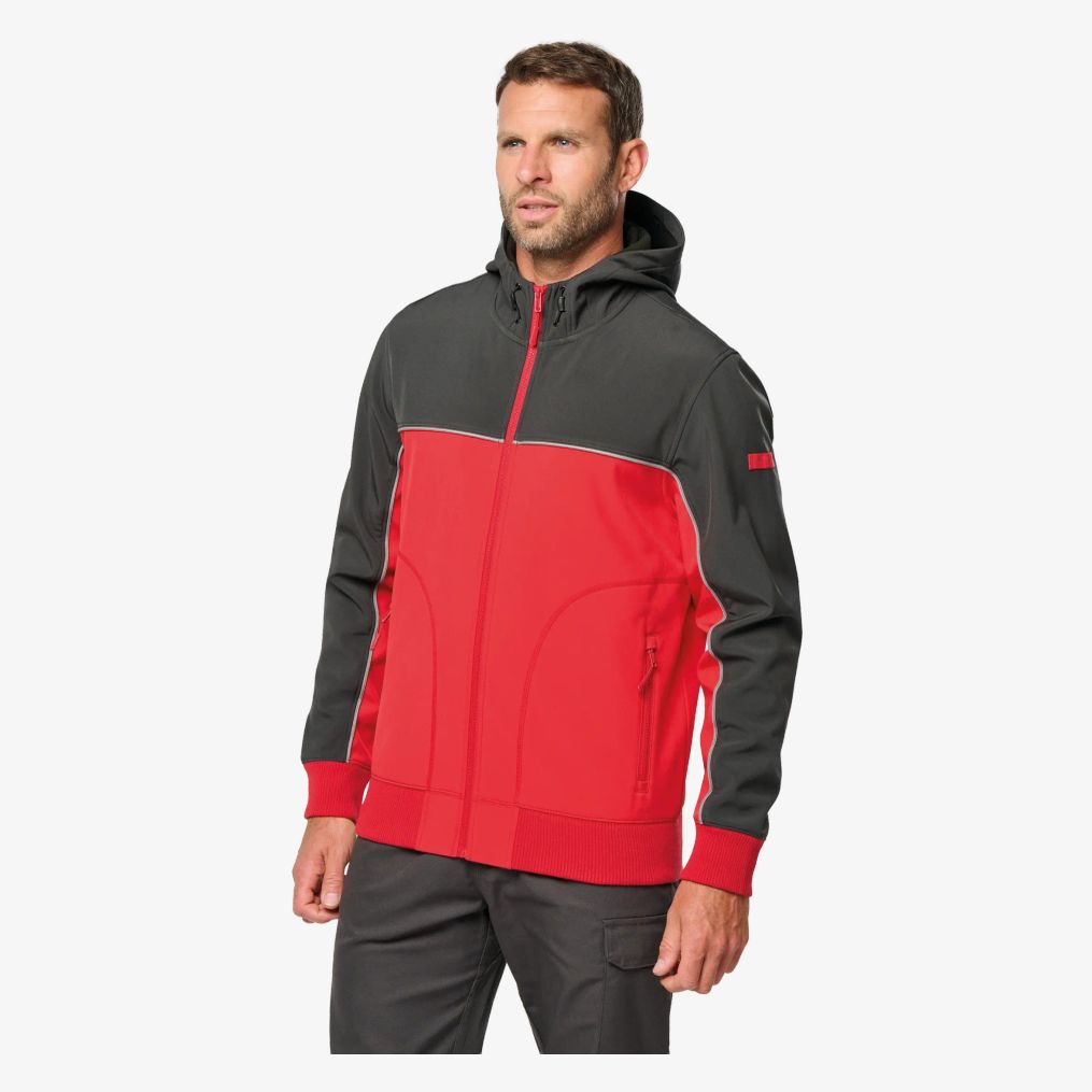 La veste softshell trois couches combine une membrane imperméable avec une bonne respirabilité et une finition sans fluor. Elle comprend une capuche réglable, deux poches zippées et un porte-stylo sur la manche. Les finitions incluent un bord-côte avec élasthanne et un passepoil contrasté.