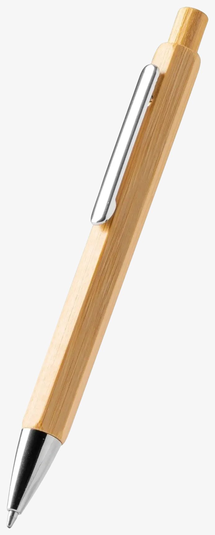 Le stylo hexagonal possède un corps en bambou associé à un mécanisme à bouton-poussoir. Ses détails chromés complètent son aspect sobre. L'encre utilisée est bleue.