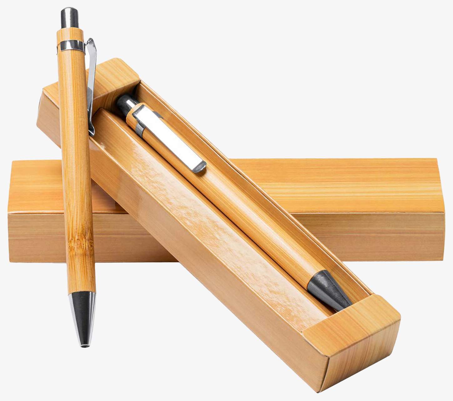 Le stylo porte-mines Kioto hw8036 comprend un corps en bambou et un mécanisme poussoir pour un usage pratique. L'encre est bleue. La boîte est en carton.