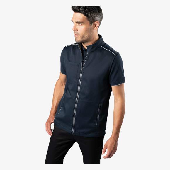 Le gilet DayToDay homme combine polyester et coton pour offrir une structure adaptée aux usages quotidiens. Il intègre deux poches latérales zippées, une poche poitrine ouverte avec porte-stylo et une étiquette nom à l'intérieur. La fermeture zippée avant est accompagnée de poches contrastées, ainsi que d'un passepoil contrasté sur les épaules et un intérieur de col contrasté avec lien d'accrochage.