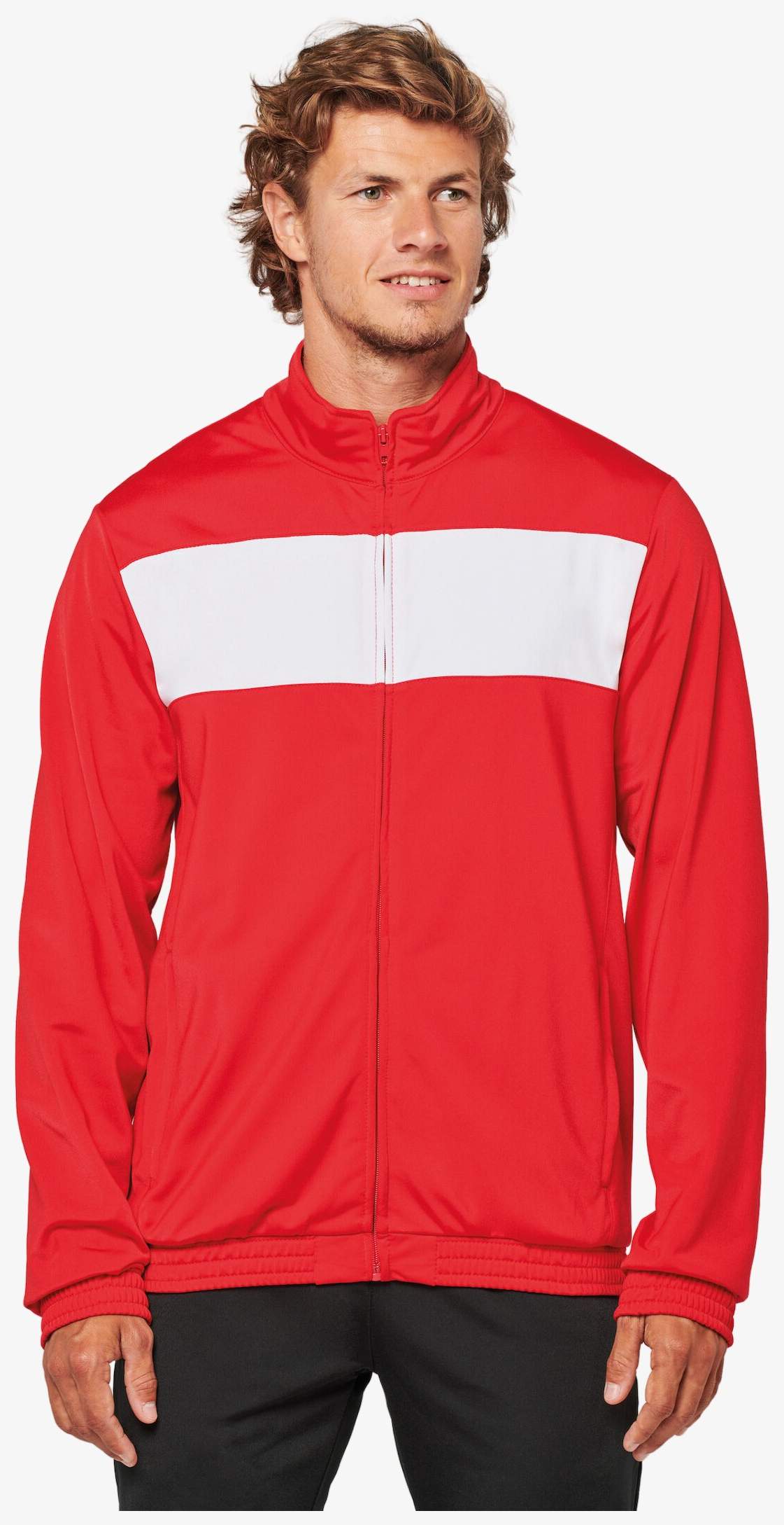 La veste survêtement adulte est conçue en polyester tricot avec fermeture zippée et empiècement poitrine contrasté. Elle comprend deux poches latérales zippées et des bas de manches élastiqués. La coupe est ajustée et moderne.