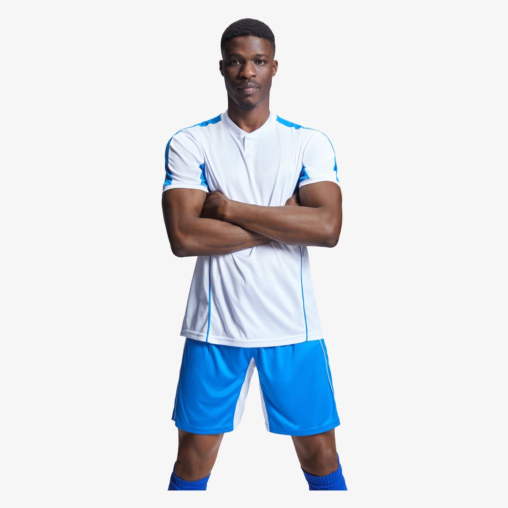 Le kit sport unisexe comprend un tee-shirt sport avec col mao et ouverture par bouton à pression ainsi qu'un short avec ceinture ajustable et cordons. Le tee-shirt intègre des panneaux en tissu control dry respirant au niveau des épaules et des aisselles. Le short présente un liseré contrasté en tissu control dry à l'intérieur de la jambe. Étiquette détachable.