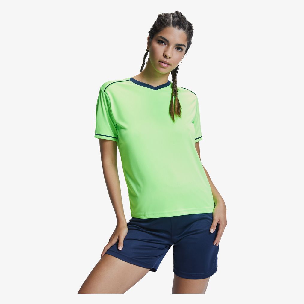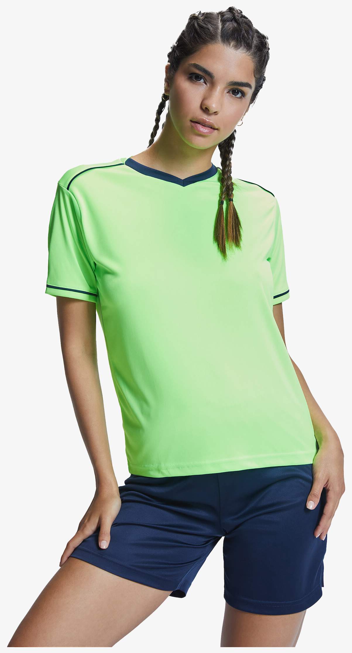 Le kit sport comprend un tee-shirt et un short. Le tee-shirt présente un double col V fantaisie avec bande de propreté intérieure renforcée, des épaules ornées d'un passepoil contrasté et des manches courtes avec liseré ornemental contrasté. Le short dispose d'une ceinture élastique avec cordon intérieur réglable et un point arrière de sécurité. Le tissu est respirant.