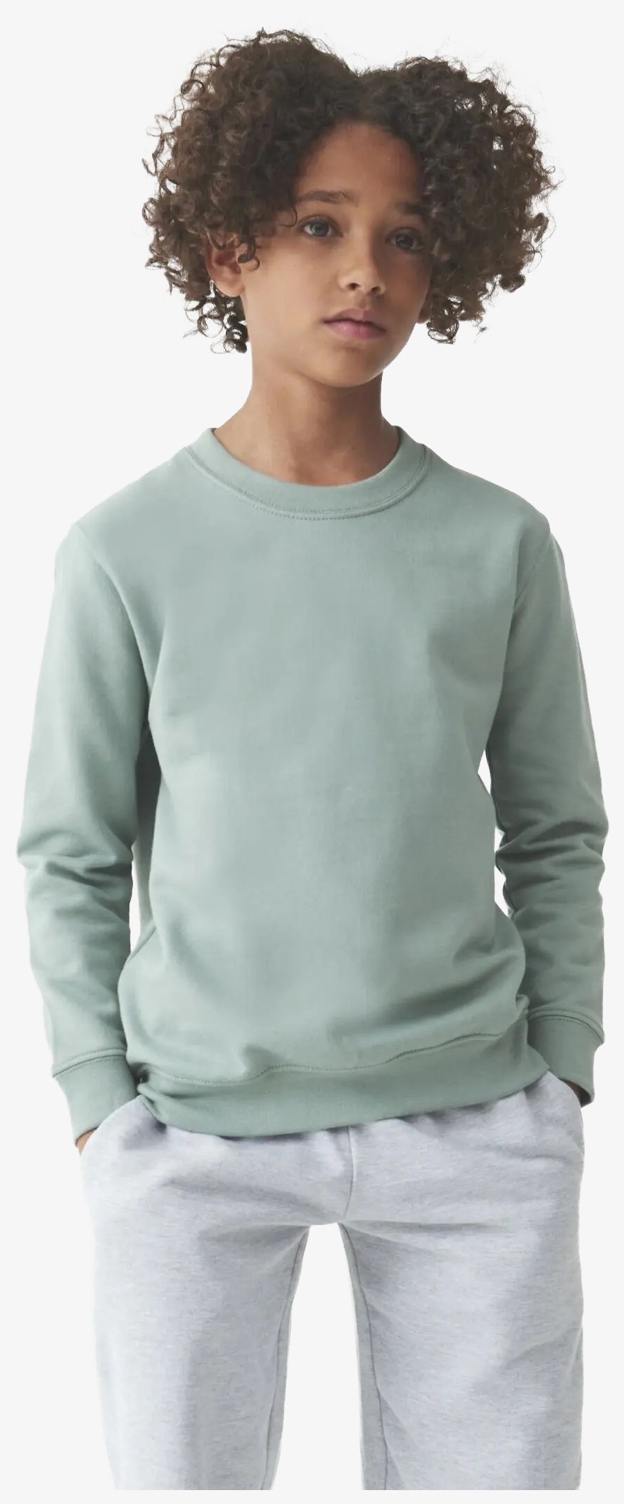 Le sweat pour enfant présente une coupe classique avec un col rond et des manches montées. Il comprend une bande de propreté, une étiquette détachable et des détails à surpiqûres doubles. Les bords au col, poignets et bord inférieur sont côtelés. Une étiquette pour le nom est cousue dans la couture latérale.