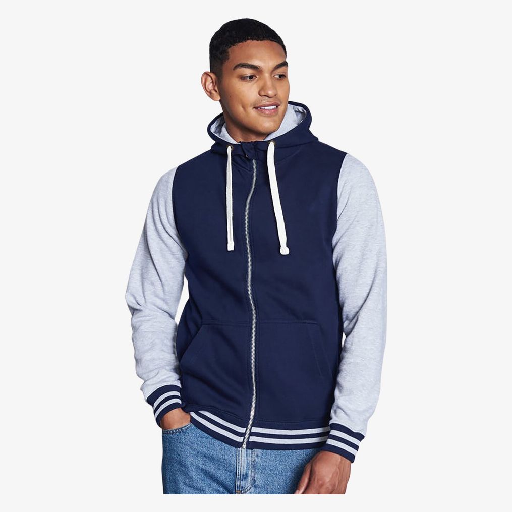 Capuche en trois parties à doublure intérieure en tissu Single Jersey contrasté. Manches contrastées. Poignets et ceinture tricot à rayures décoratives. Zip et tirette YKK métalliques avec mentonnière. Grande poche kangourou. Cordons de serrage en dentelle larges écru. Petite ouverture cachée pour y faire passer les fils d'oreillettes dans la poche droite. Passants cachés pour les fils d'oreillettes. Tissu en coton doux, l'idéal pour en imprimer la surface. Production certifiée WRAP (Worldwide Responsible Accredited Production)Etiquette détachable idéale pour une personnalisation facile. Composition : 80% Ringspun Coton, 20% Polyester Grammage : 330g/m²