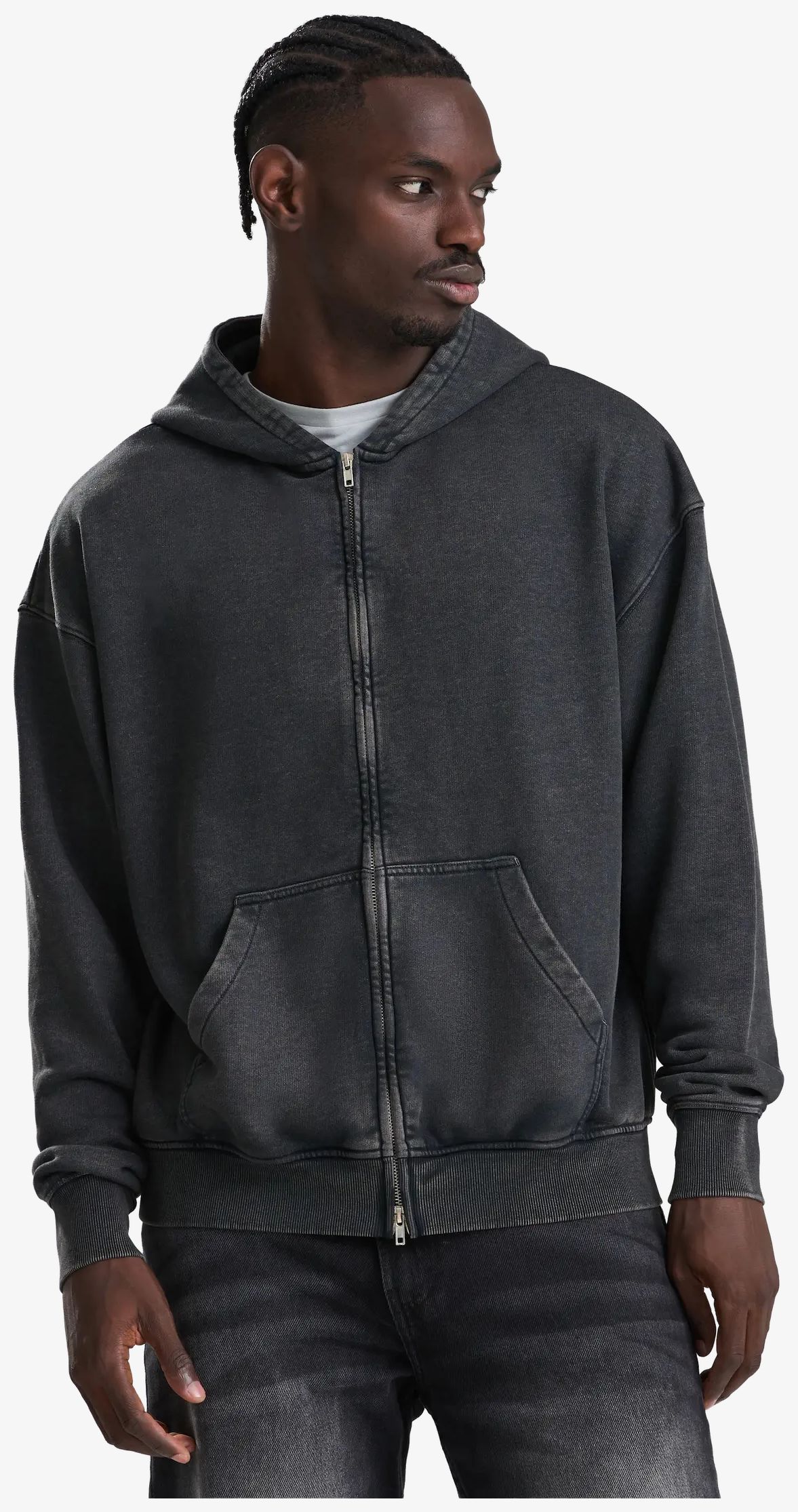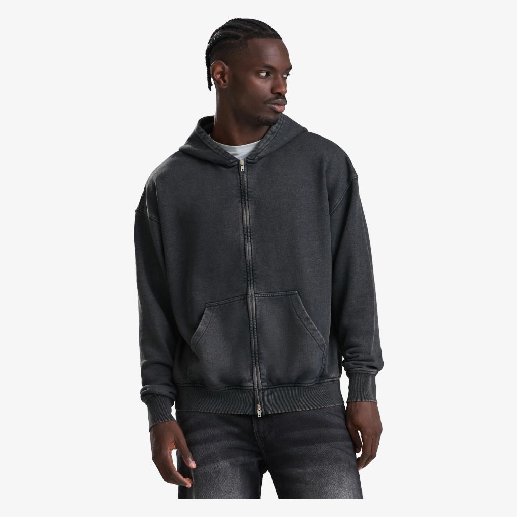 Sweat à capuche zippé effet délavé. Effet délavé vintage. Capuche double couche sans cordon de serrage. Coupe oversize. Zip double argenté. Poche kangourou. Poignets et ourlets côtelés. Intérieur en french terry. Étiquette de taille uniquement. Fabriqué avec du polyester recyclé. Composition : 70 % better coton, 30 % polyester recyclé. Grammage : 380g/m²