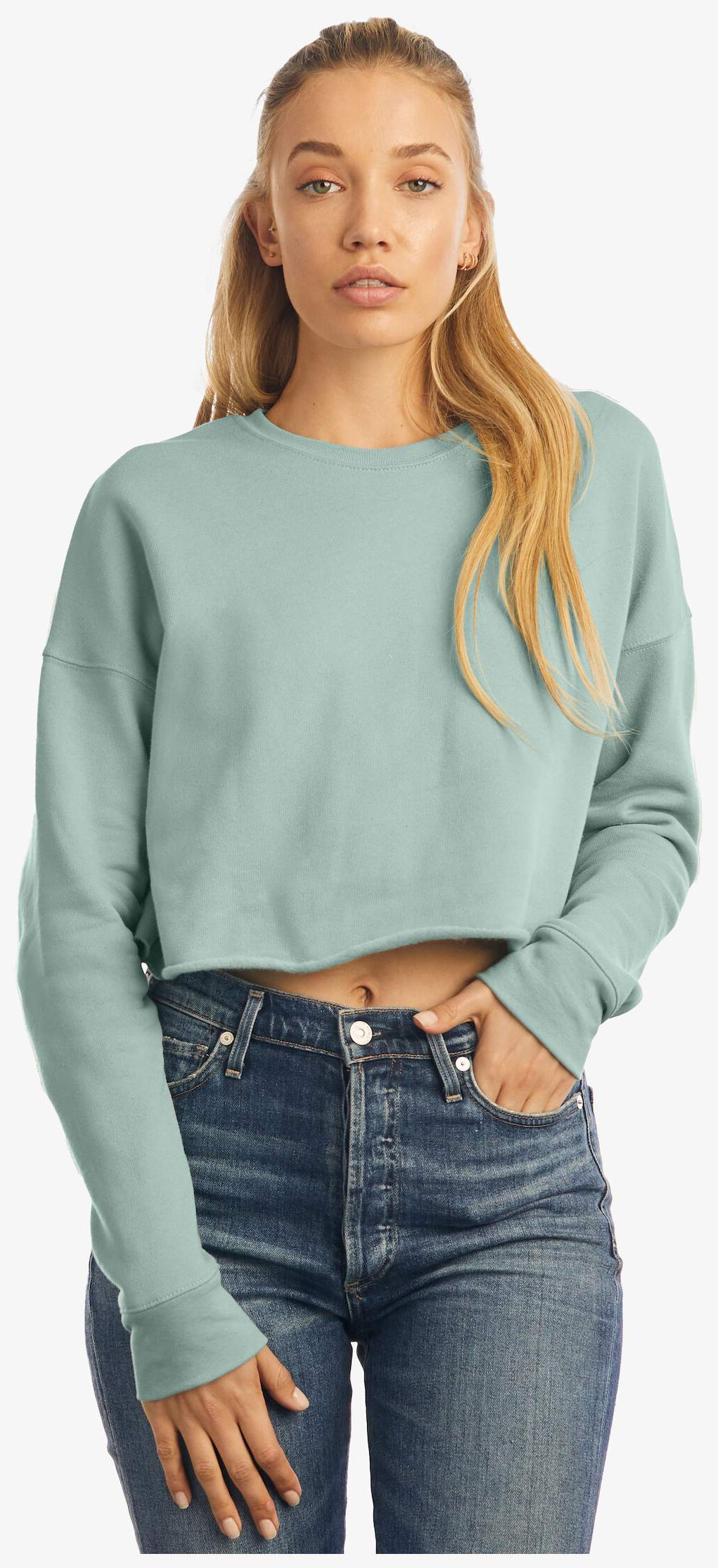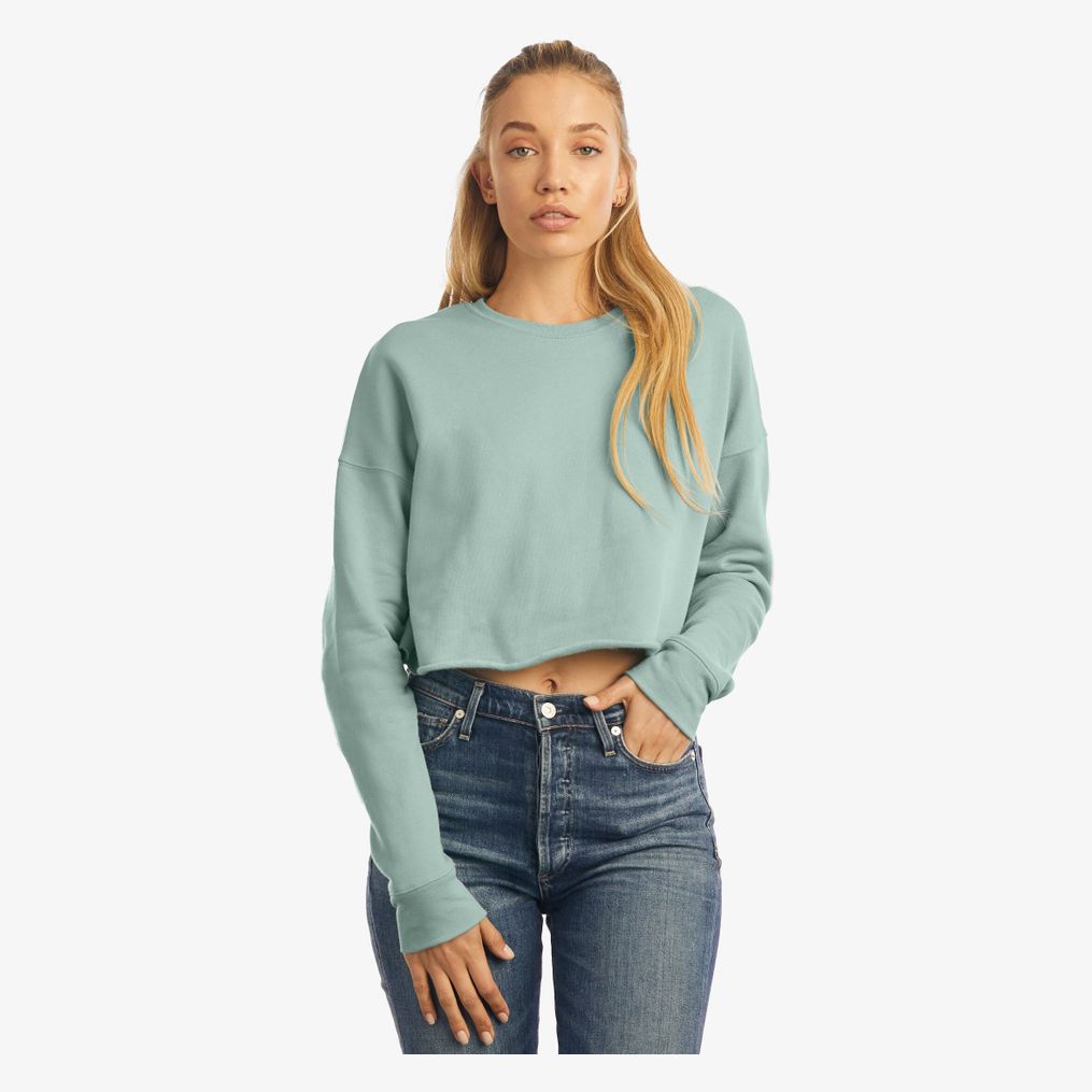 Le Women's cropped crew fleece est un sweat court combinant coton peigné ringspun airlume et polyester. Il intègre des coutures latérales, des bords brut à la taille et des poignets en bords côte.