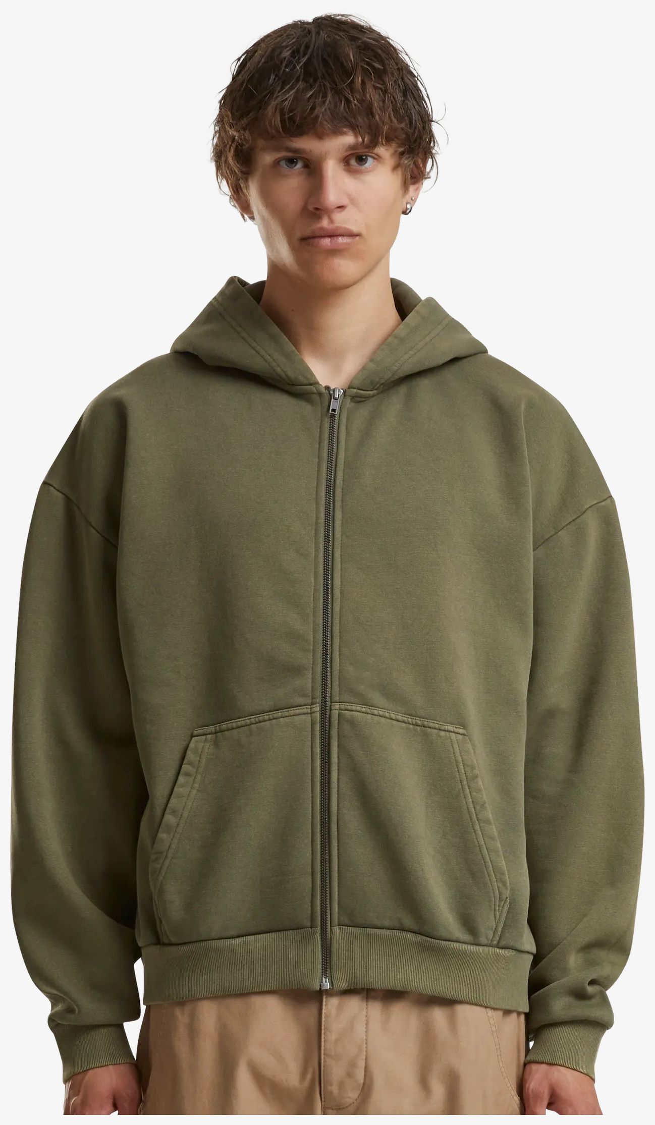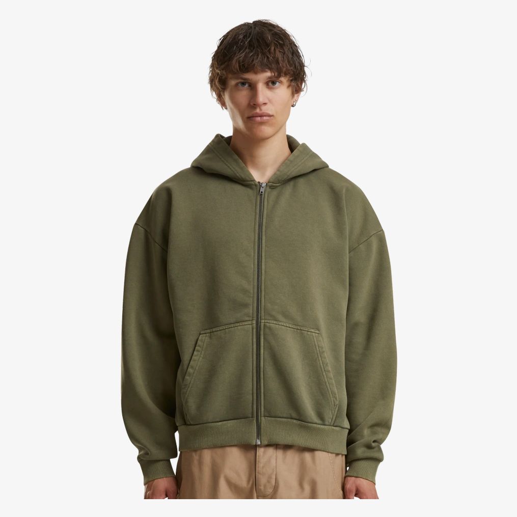 Le Vintage zip Hoodie est un sweat à capuche zippé à l’aspect délavé, avec coupe boxy, deux poches frontales et intérieur gratté, adapté à un usage quotidien.