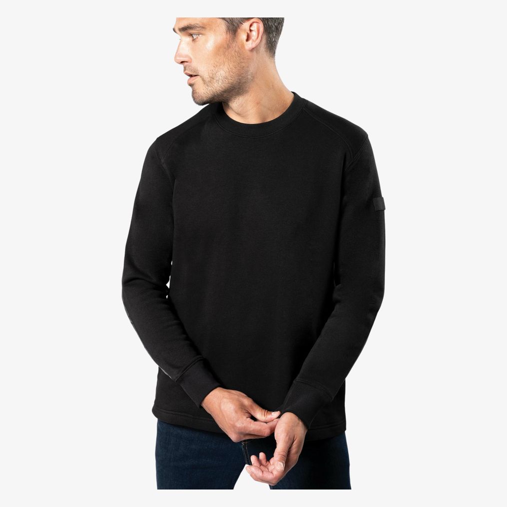 80% coton / 20% polyester. Molleton 3 fils avec traitement LSF (Low Shrinckage Fleece). Lavable à 60°C. Col rond et bas de manches en bord-côte. Poche zippée invisible côté droit. Renforts sur épaules et coudes pour plus de résistance. Porte stylo sur manche gauche. Finition demi-lune au dos. Lien d'accrochage dans le col. Finition double aiguille au bas du vêtement et dos rallongé pour plus de confort. Grammage : 300g/m²