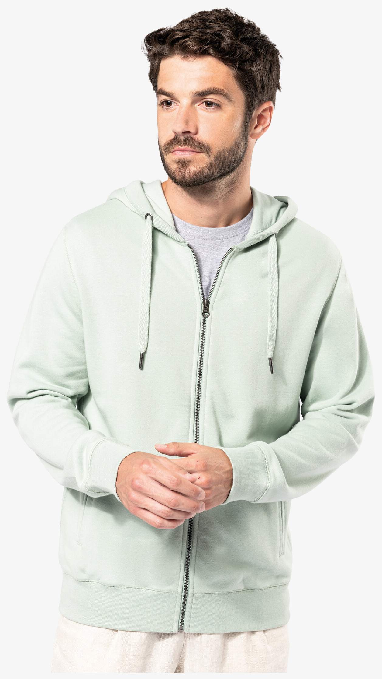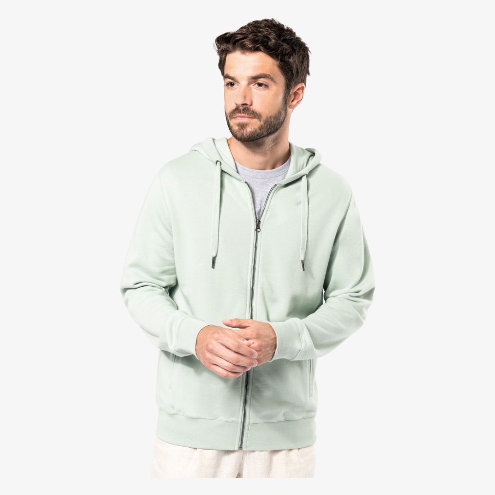 Le sweat-shirt french terry écoresponsable zippé à capuche unisexe associe 80 % coton biologique et 20 % polyester recyclé (variante Oxford Grey 75 % coton, 25 % polyester). Il dispose d'une coupe ajustée avec capuche doublée et deux poches passepoilées devant. La fermeture zippée est en métal. Le bord-côte orne le bas et les manches et un cordon ton sur ton équipe la capuche.
