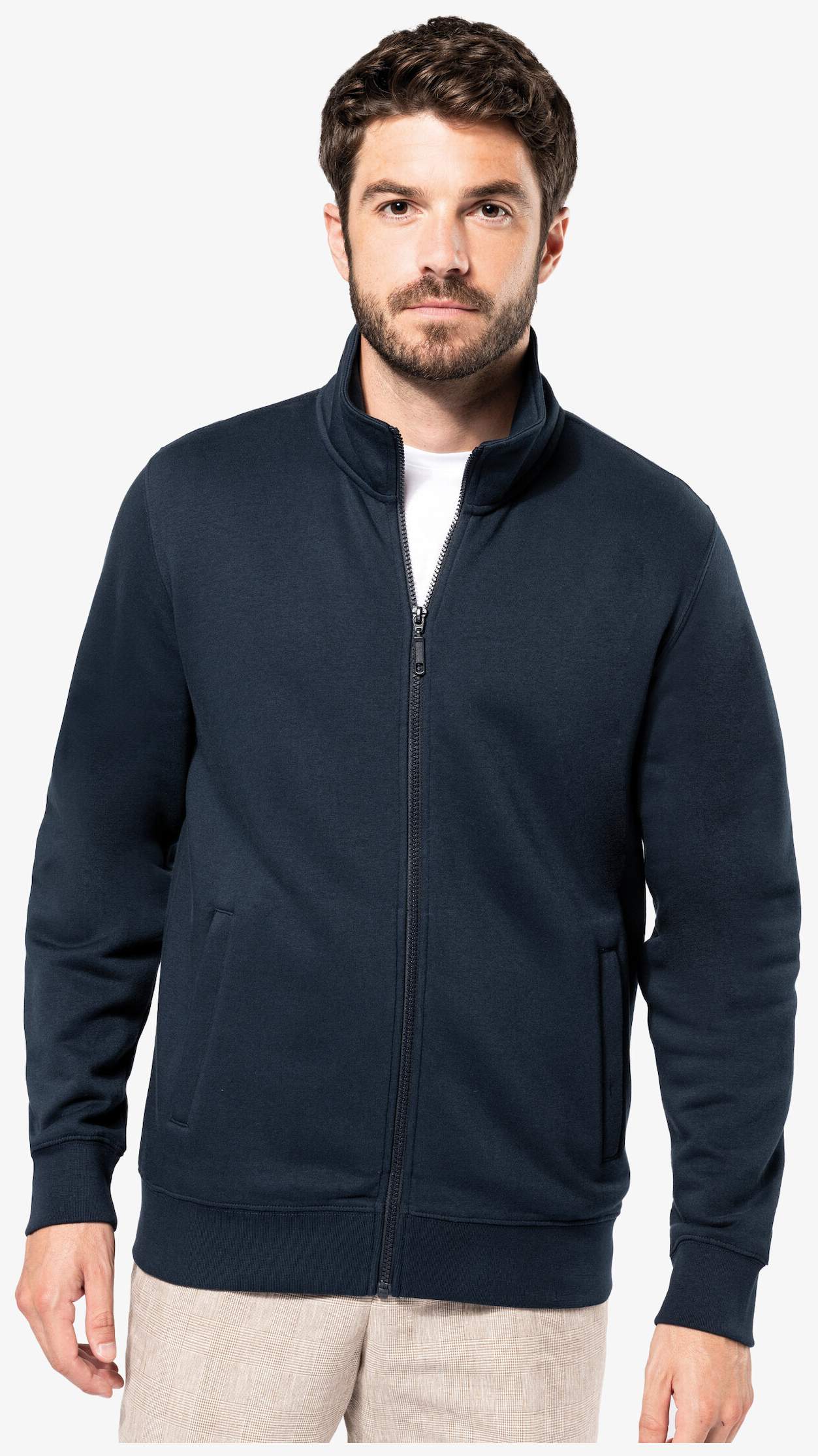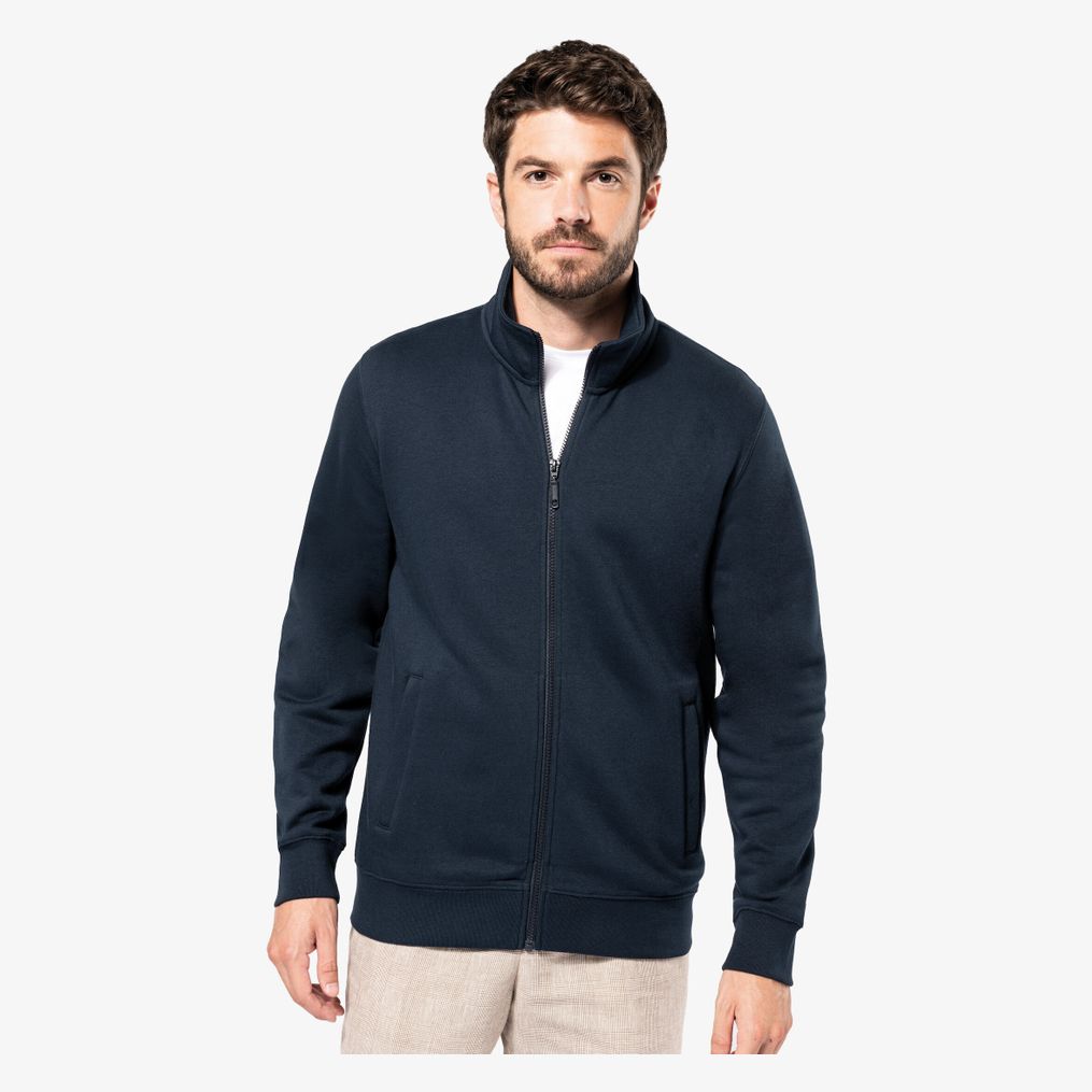 La veste molleton gratté homme présente une coupe ajustée avec manches droites et col montant. Elle dispose d'une fermeture zippée plastique ton sur ton et de deux poches zippées passepoilées sur les côtés. Une finition demi-lune à l'encolure dos facilite la pose d'étiquette intérieure. Le bas des manches et du vêtement est en bord-côte 1x1. Le molleton est prérétréci.