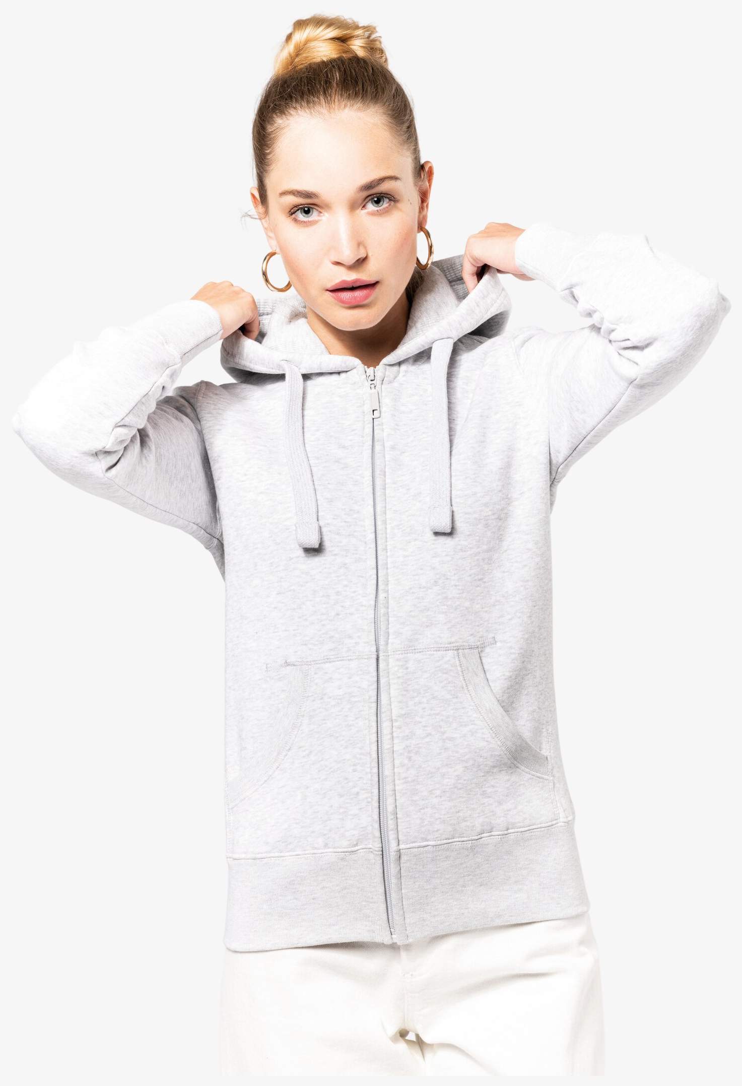 Le sweat-shirt zippé capuche femme est conçu en molleton gratté associant 80% coton peigné et 20% polyester. Il présente une bande propreté contrastée à l'encolure et une capuche doublée nid d'abeille. Le vêtement intègre des poches kangourou et un bord-côte aux manches et au bas. La fermeture zippée est de type ykk®.