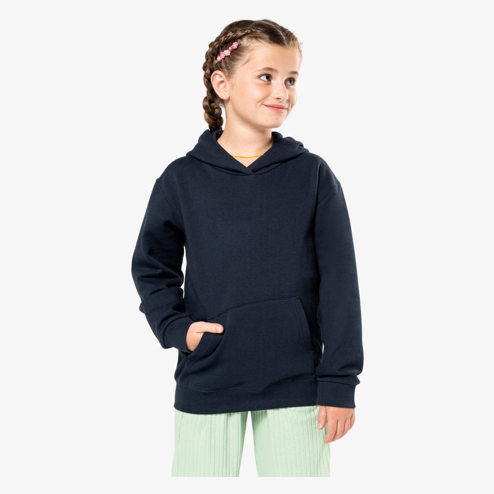 Le sweat-shirt capuche enfant est conçu en molleton gratté composé de 80% coton et 20% polyester. Il comprend une capuche doublée, des manches montées et une coupe tubulaire. La finition bord-côte est présente au bas des manches et du vêtement.