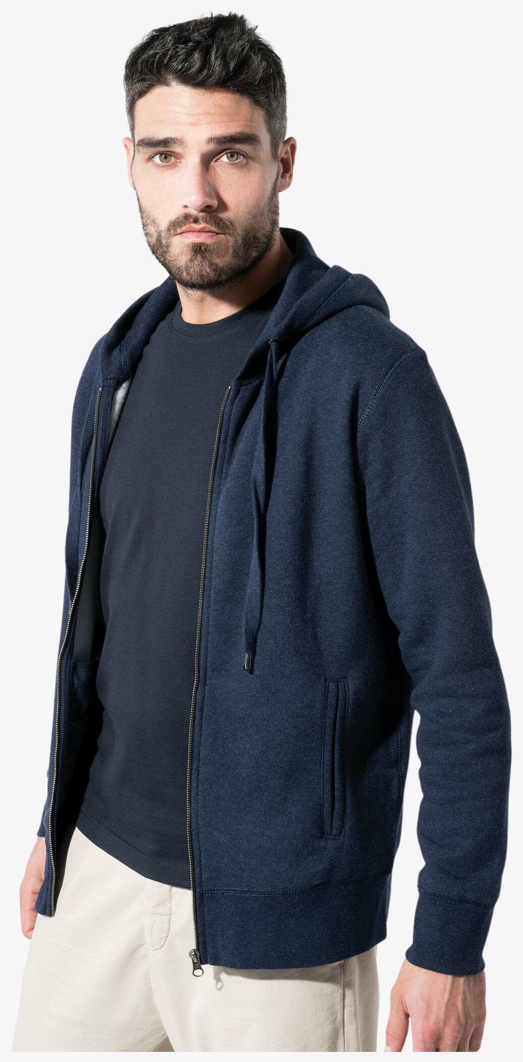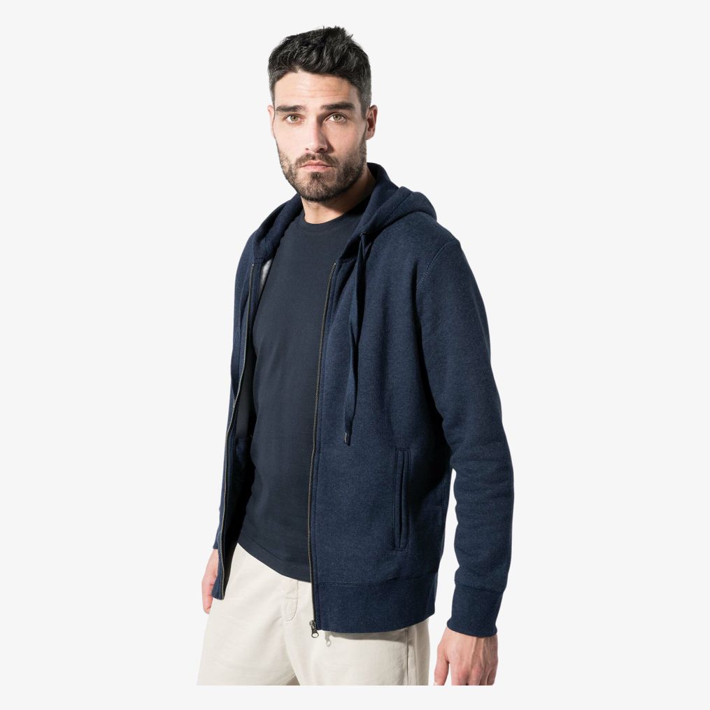 80% coton biologique / 20% polyester certifié OCS Blended - Organic Content Standard. Molleton gratté. Coupe mode. 2 poches passepoilées devant. Fermeture zippée métal. Bord-côte bas de manches, de vêtement et pourtour de capuche doublée avec cordon de serrage ton sur ton. Bande de propreté chevron intérieur col. Passe-fil sur poche avant et au col. Pas d'étiquette de marque au col, uniquement une puce de taille pour faciliter la personnalisation. Grammage : 300g/m²