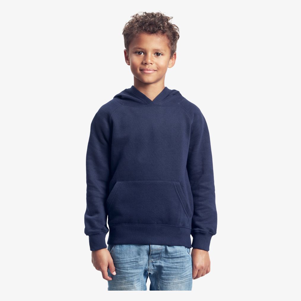 Le Kids Hoodie est un sweat à capuche composé de coton biologique peigné certifié commerce équitable. Il comprend une capuche doublée et une poche kangourou, manches longues avec côtes aux manches et bas. Lycra/Elasthanne est utilisé sur les épaules et le bas.