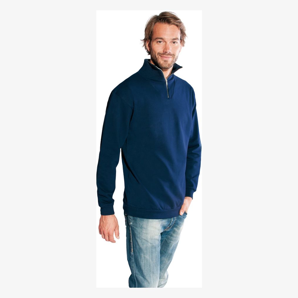 Sweat avec col zippé , présence d'élasthanne dans les poignets et la taille. Molleton brossé 100 % coton. Grammage : 320g/m²