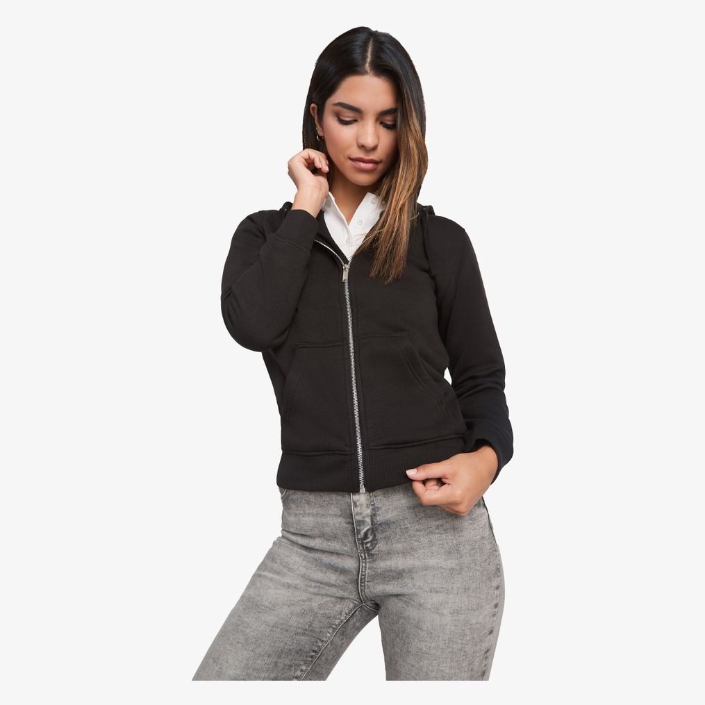 Le sweat zippé femme Veleta intègre une capuche doublée ton sur ton avec fermeture éclair métallique argentée sur le devant et une poche kangourou. La bande de propreté est renforcée à l'intérieur du cou. Les poignets et la ceinture sont en côte 2x2. La coupe est près du corps, adaptée à un usage courant.