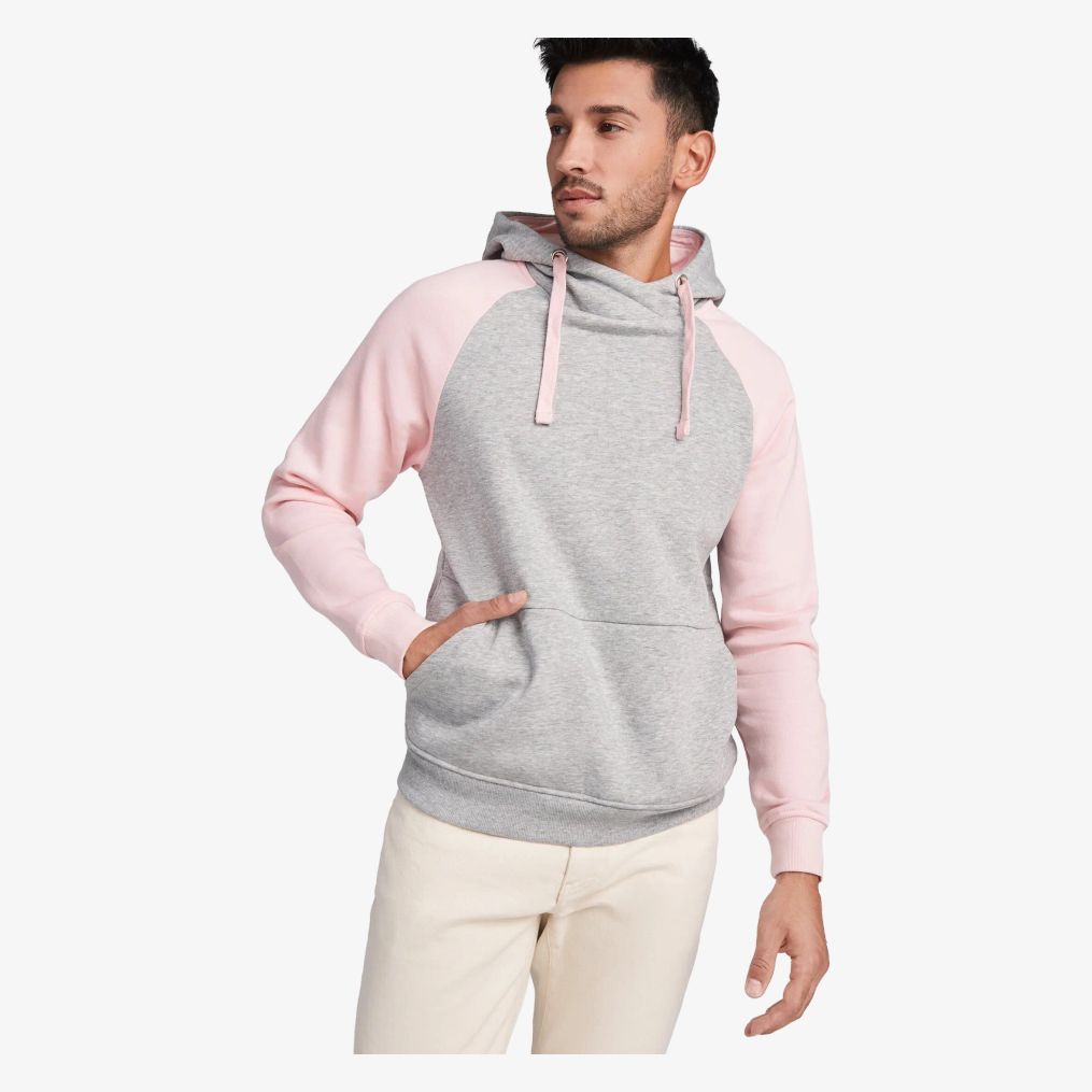 Le sweat à capuche bi-couleur unisexe intègre une capuche à col croisé avec œillets métalliques et cordons contrastés. Les manches raglan contrastées et la poche kangourou complètent sa conception. Poignets bas côte avec élasthanne 1x1 assurent une finition adaptée.