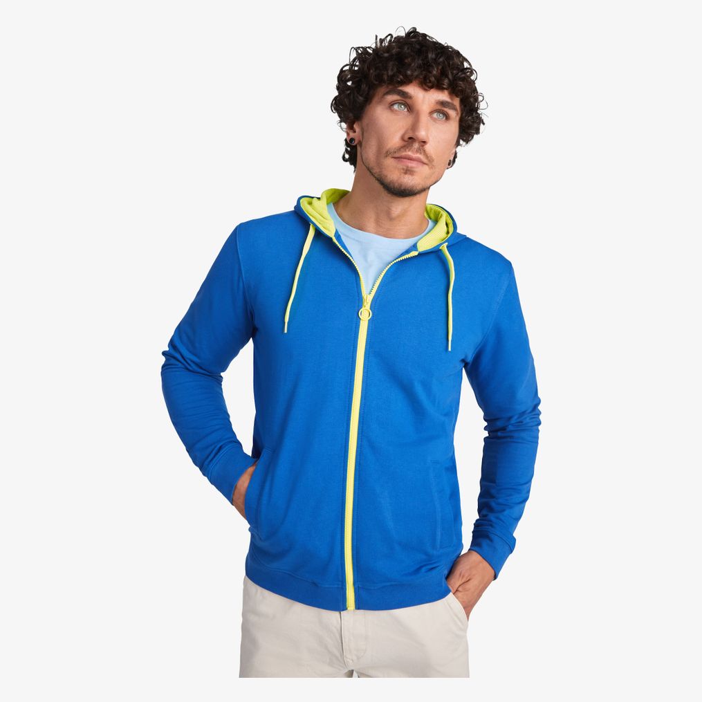 Le sweat zippé en maille molleton non gratté présente des détails fluo. Il possède une fermeture zippée centrée avec curseur arrondi contrasté, une capuche doublée en polyester micro perforé et un cordon avec œillets métalliques contrastés. Les manches longues sont équipées de poignets ceinture côte 1x1. Deux poches frontales comportent un liseré large. L'encolure est renforcée par une bande de propreté. Une étiquette est détachable.