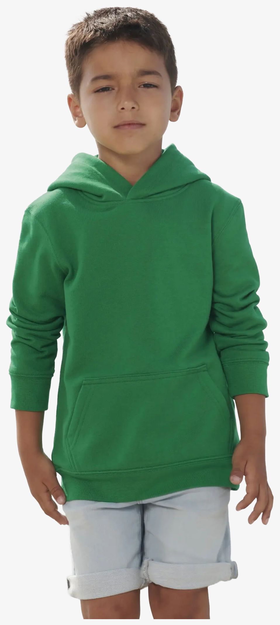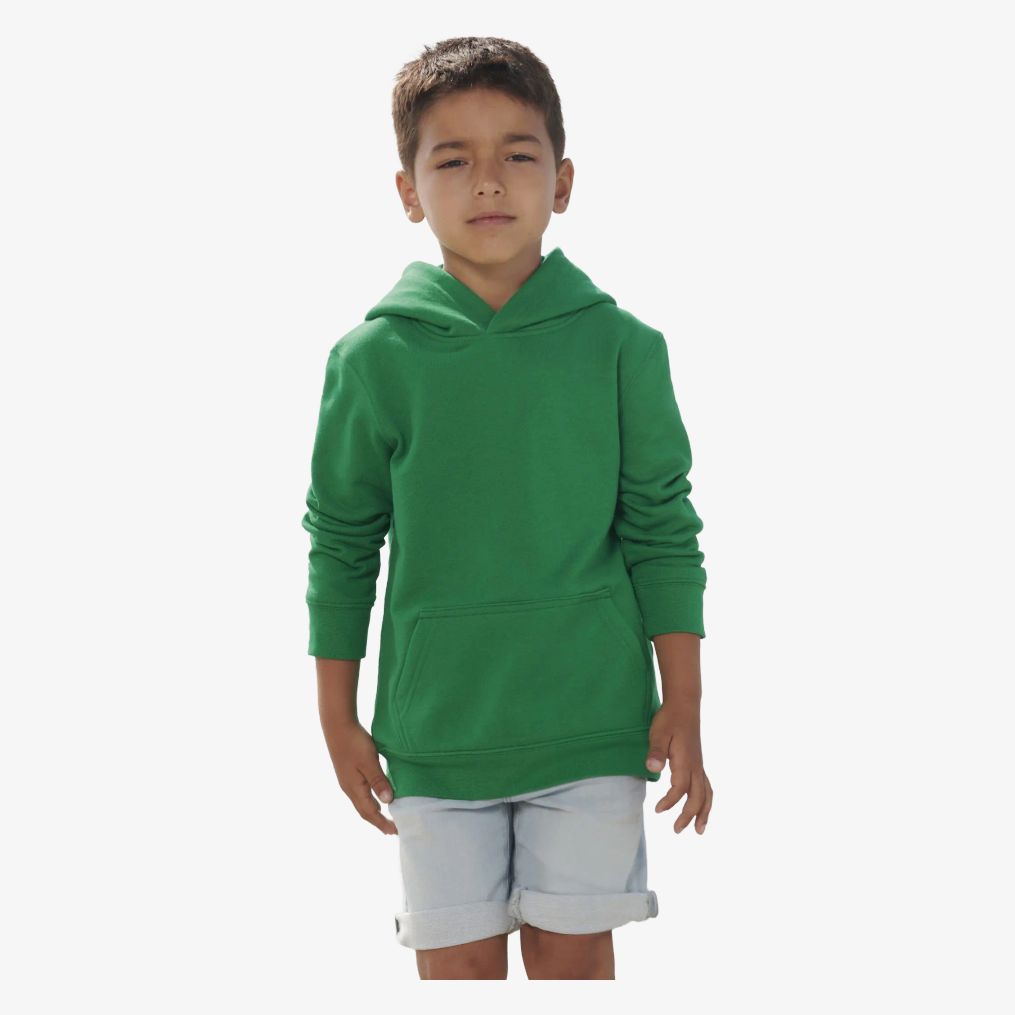 Le sweat à capuche enfant dispose de manches montées et d'une coupe cousue. Il inclut une poche kangourou et une capuche doublée. Un bord côte 1x1 est présent aux poignets et à la base, ainsi qu'une demi-lune bande propreté jersey dans l'encolure. La coupe est décontractée.