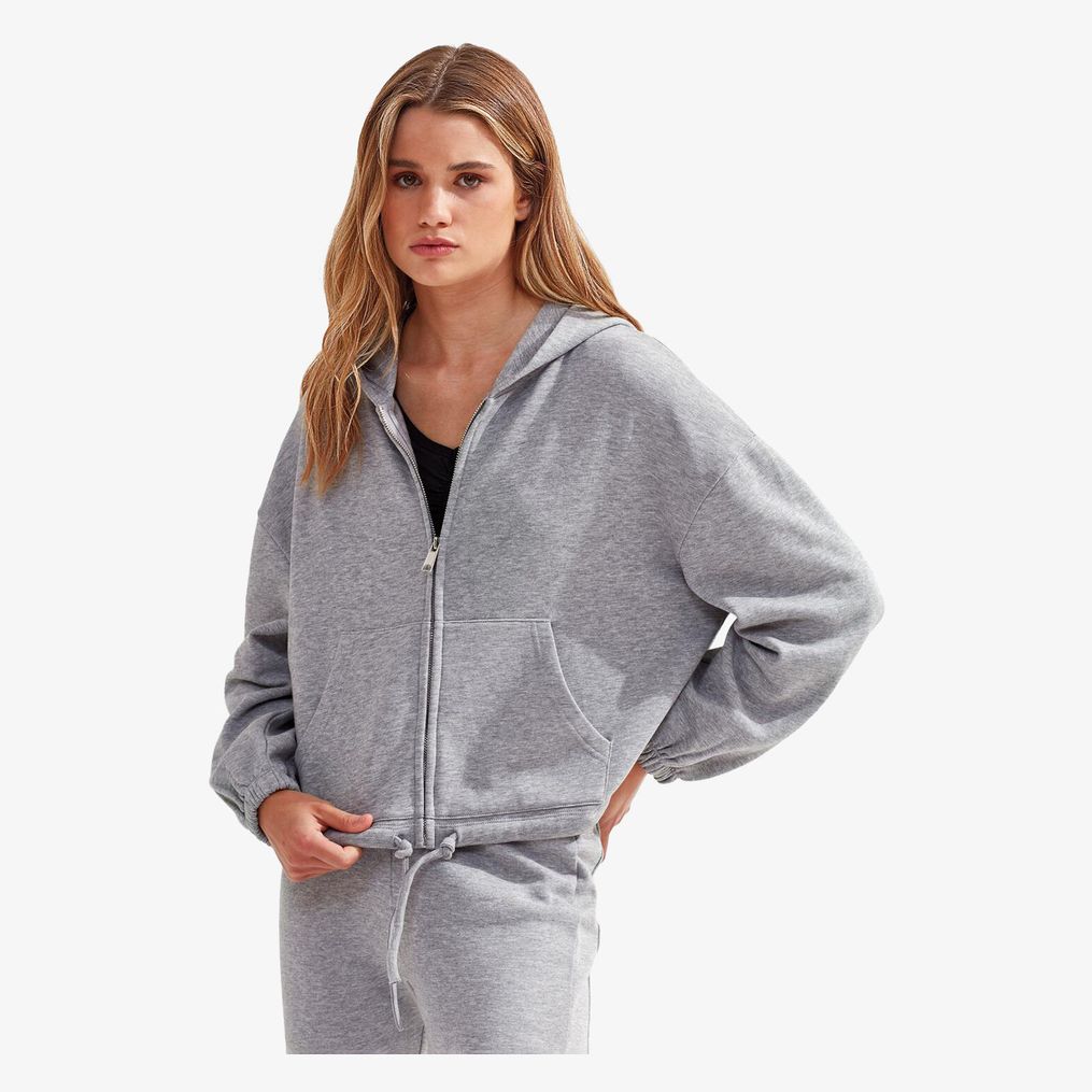 Le sweat à capuche zippé femme en tissu recyclé avec cordon de serrage associe coupe crop-top oversize et fermeture zippée centrale pour un ajustement flexible. Il comprend des poches kangourou à l'avant.