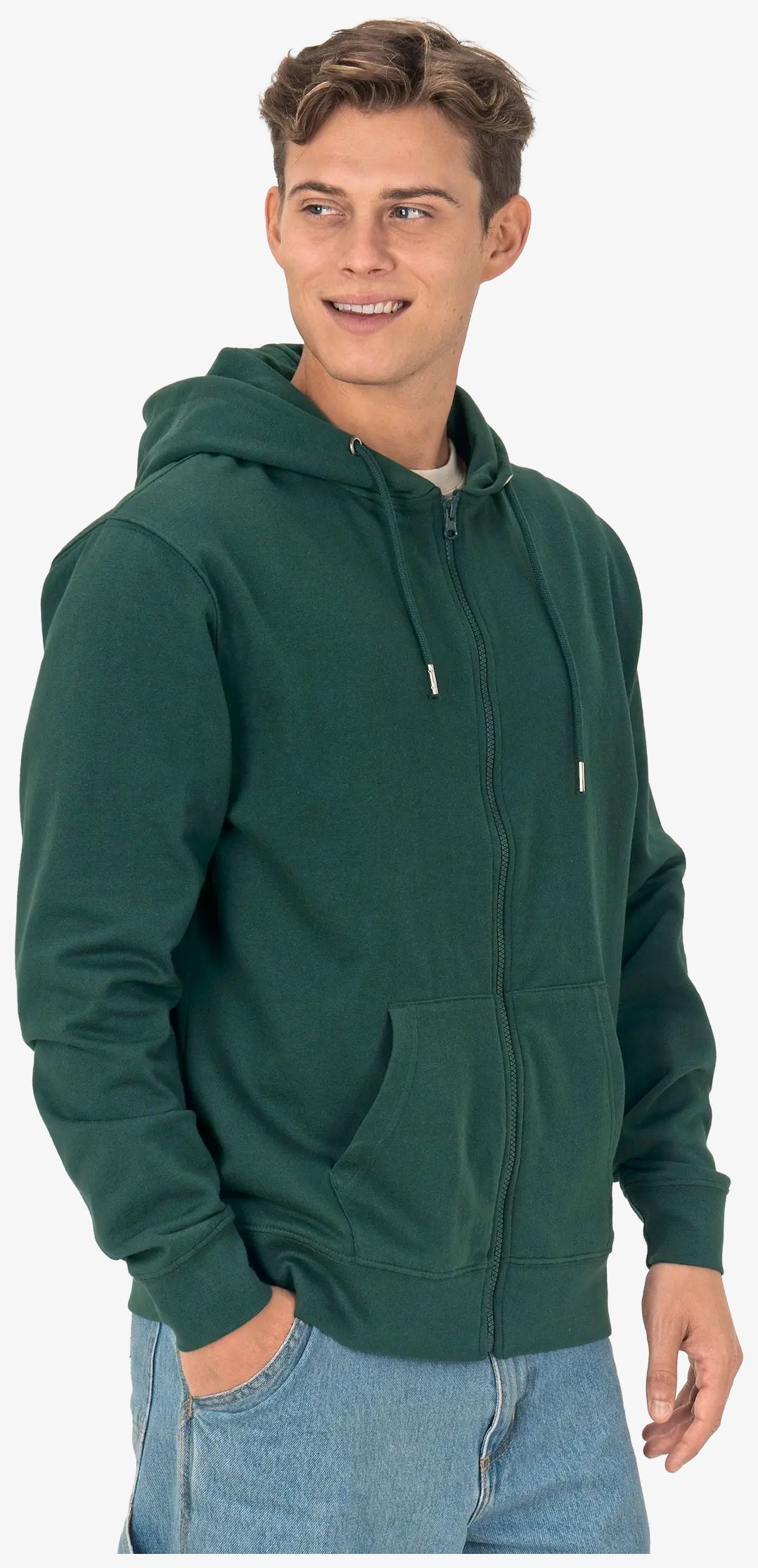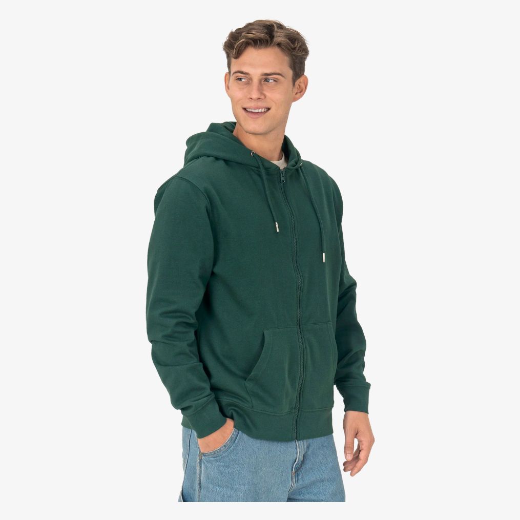 Le sweat à capuche zippé unisexe présente un intérieur polaire et une capuche double épaisseur avec œillets métalliques et cordons à pointe métallique. Il comprend une grande poche avant, des poignets et un ourlet inférieurs côtelés ainsi que des coutures latérales.