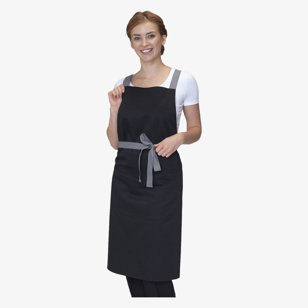 Le tablier Crossback Apron est confectionné en polyester et coton. Il mesure 71 cm sur 91 cm et comprend un lien contrasté gris.