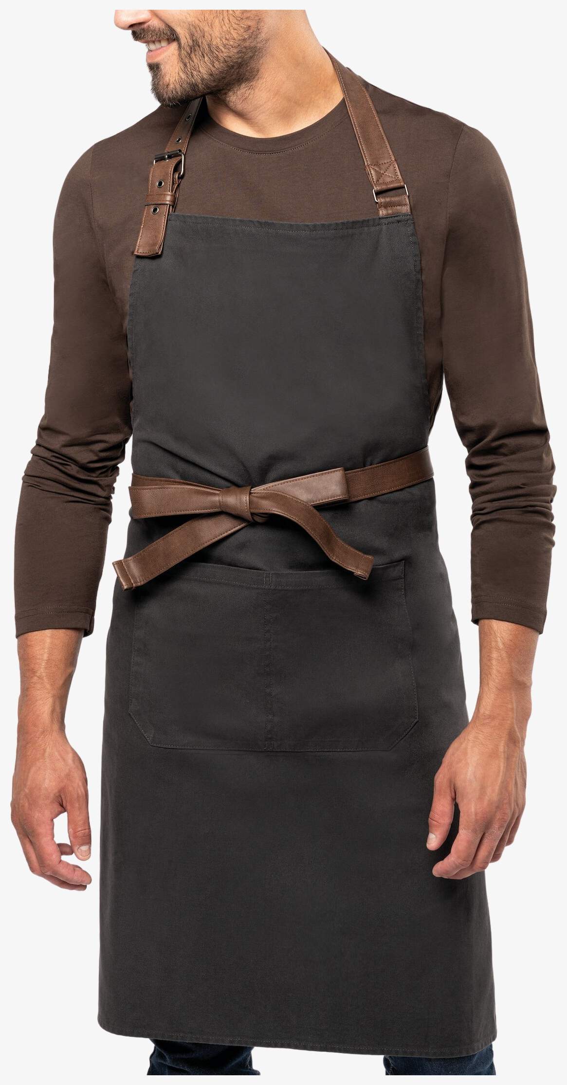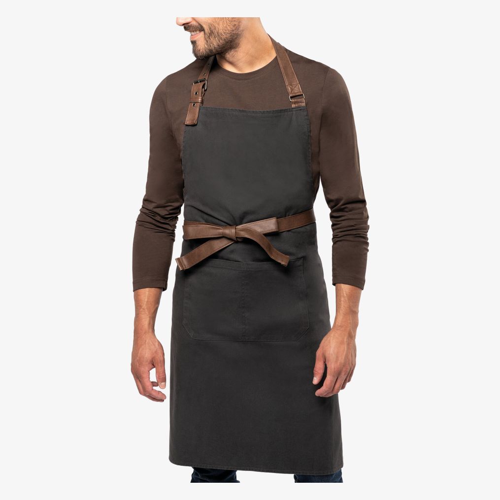 Le tablier coton vintage est conçu en tissu canvas 100% coton. Il comporte une boucle métal avec œillets pour ajuster la longueur au niveau du cou ainsi que des sangles d'attache en tissu enduit. Il inclut une grande poche avec deux compartiments.