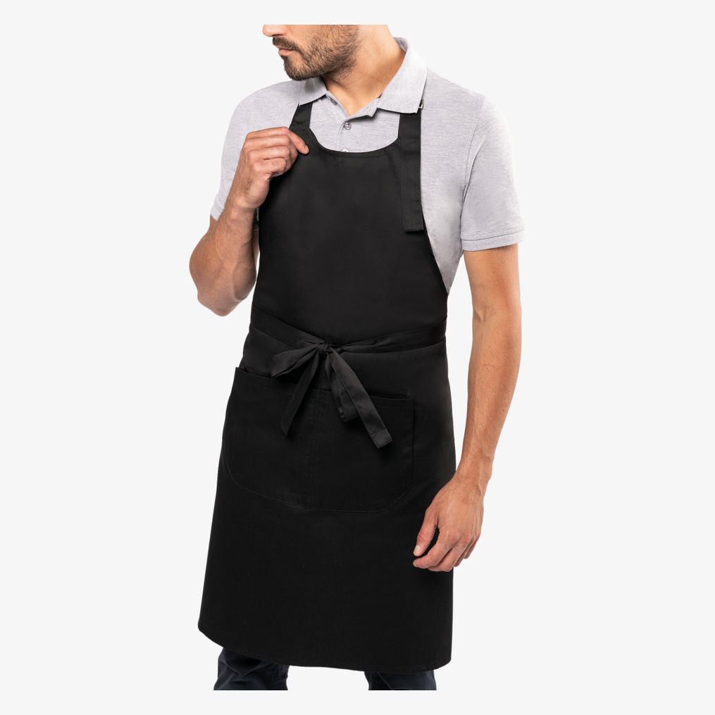 Le tablier polycoton lavage combine 65% polyester et 35% coton. Il intègre une boucle métal pour ajuster la longueur au niveau du cou et une grande poche avant divisée en deux compartiments.