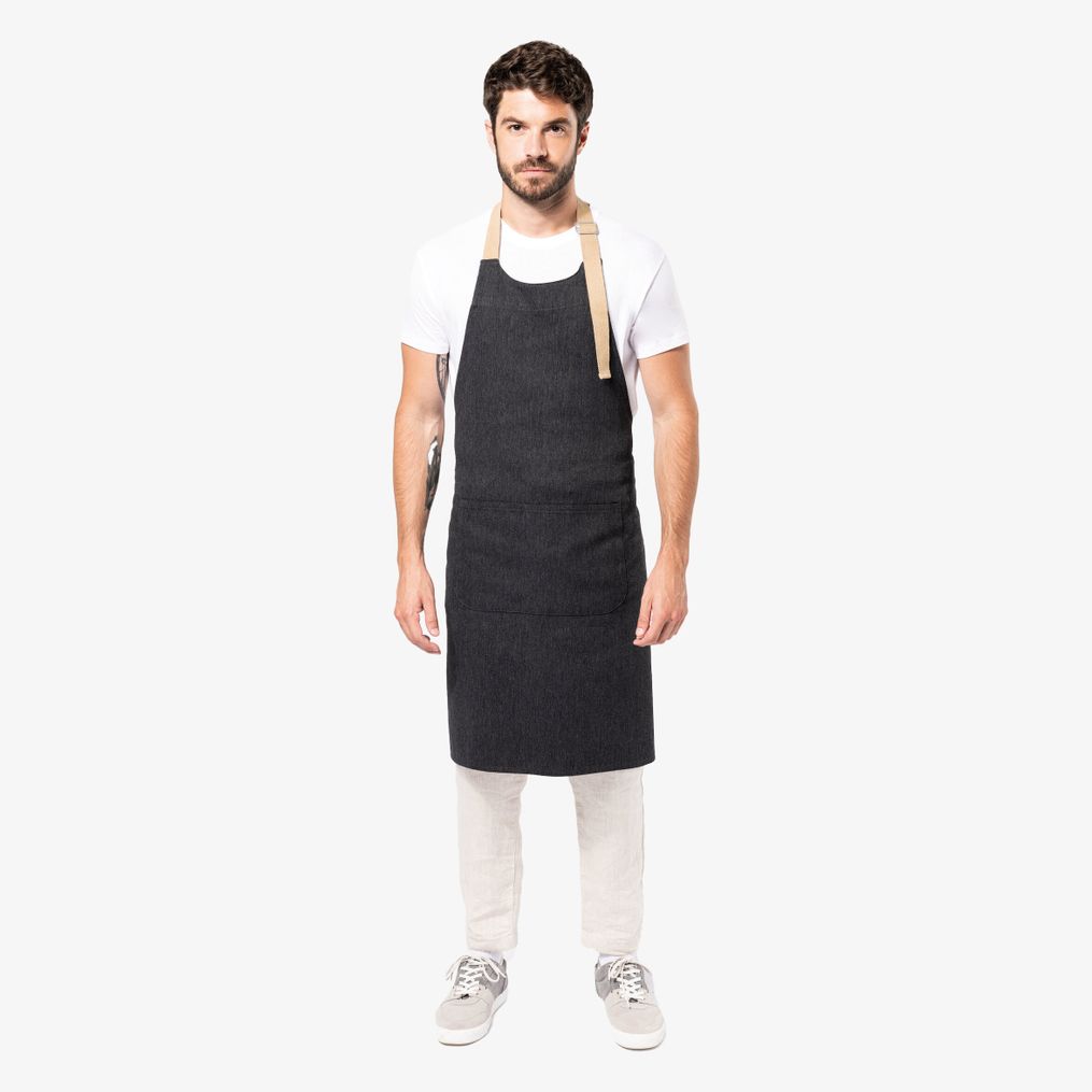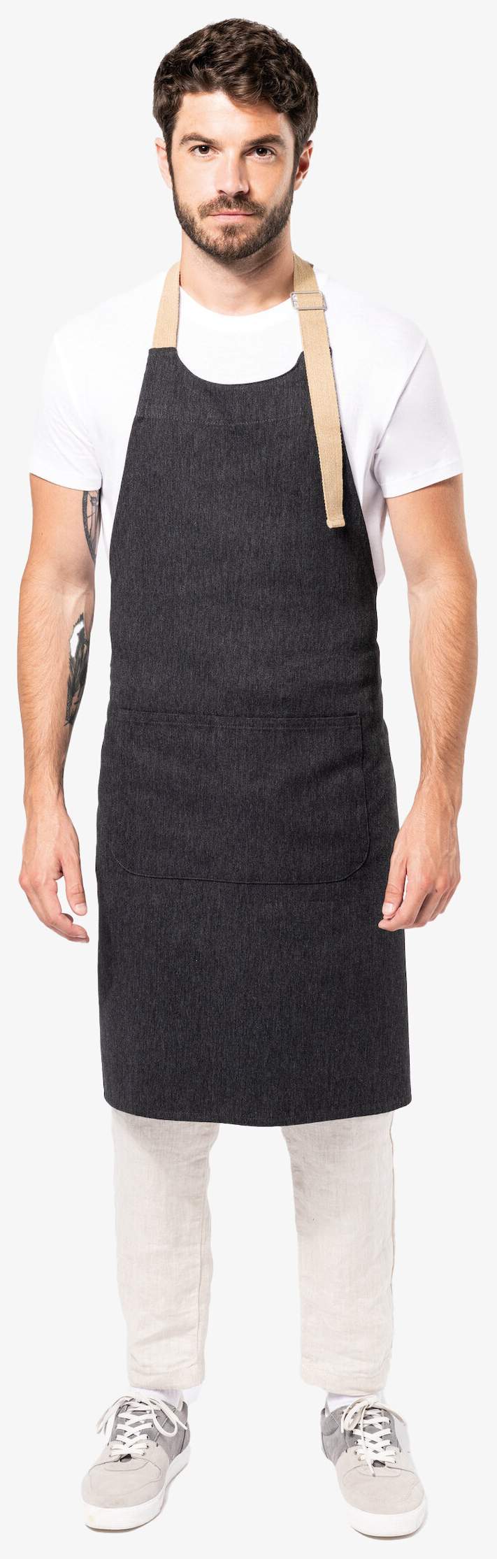 Le tablier écoresponsable unisexe est conçu avec une boucle de réglage en métal au niveau du cou pour ajuster la longueur. Il comprend une grande poche avant divisée en deux compartiments. La sangle taille encolure est en coton recyclé, coloris Hemp. Le tissu issu d'un processus de recyclage peut présenter de légères variations de couleur.