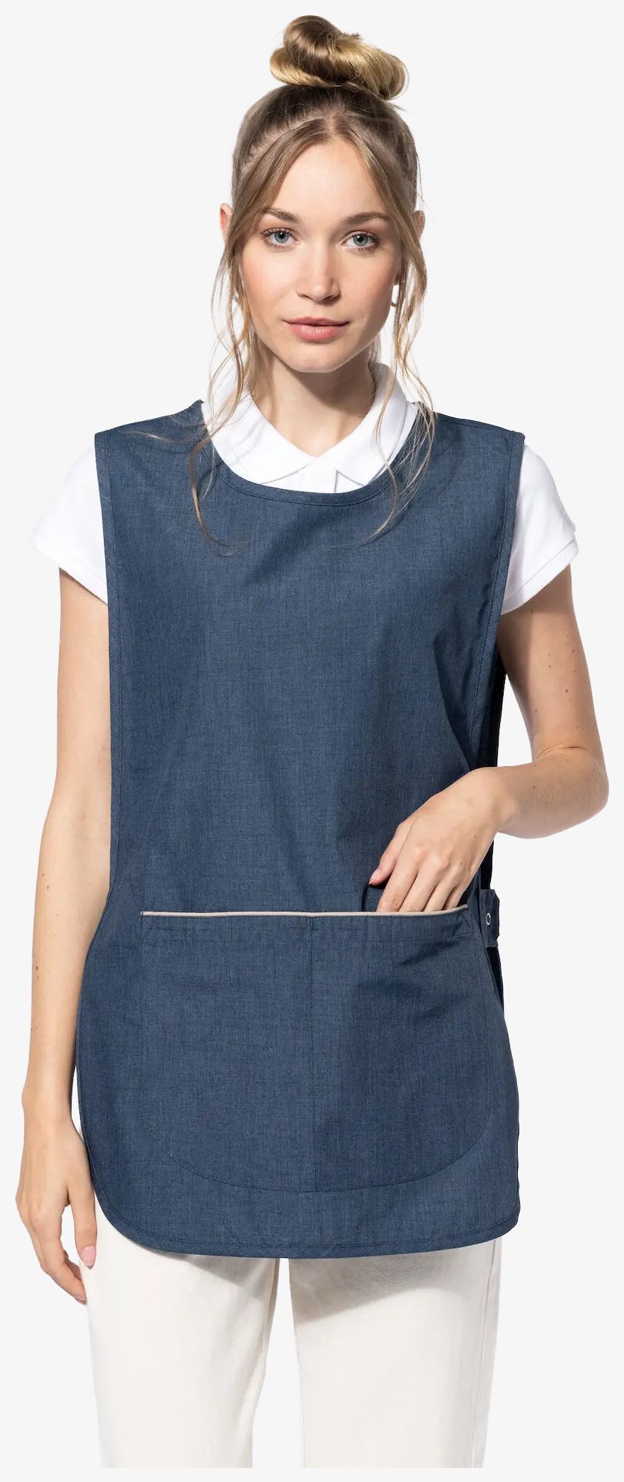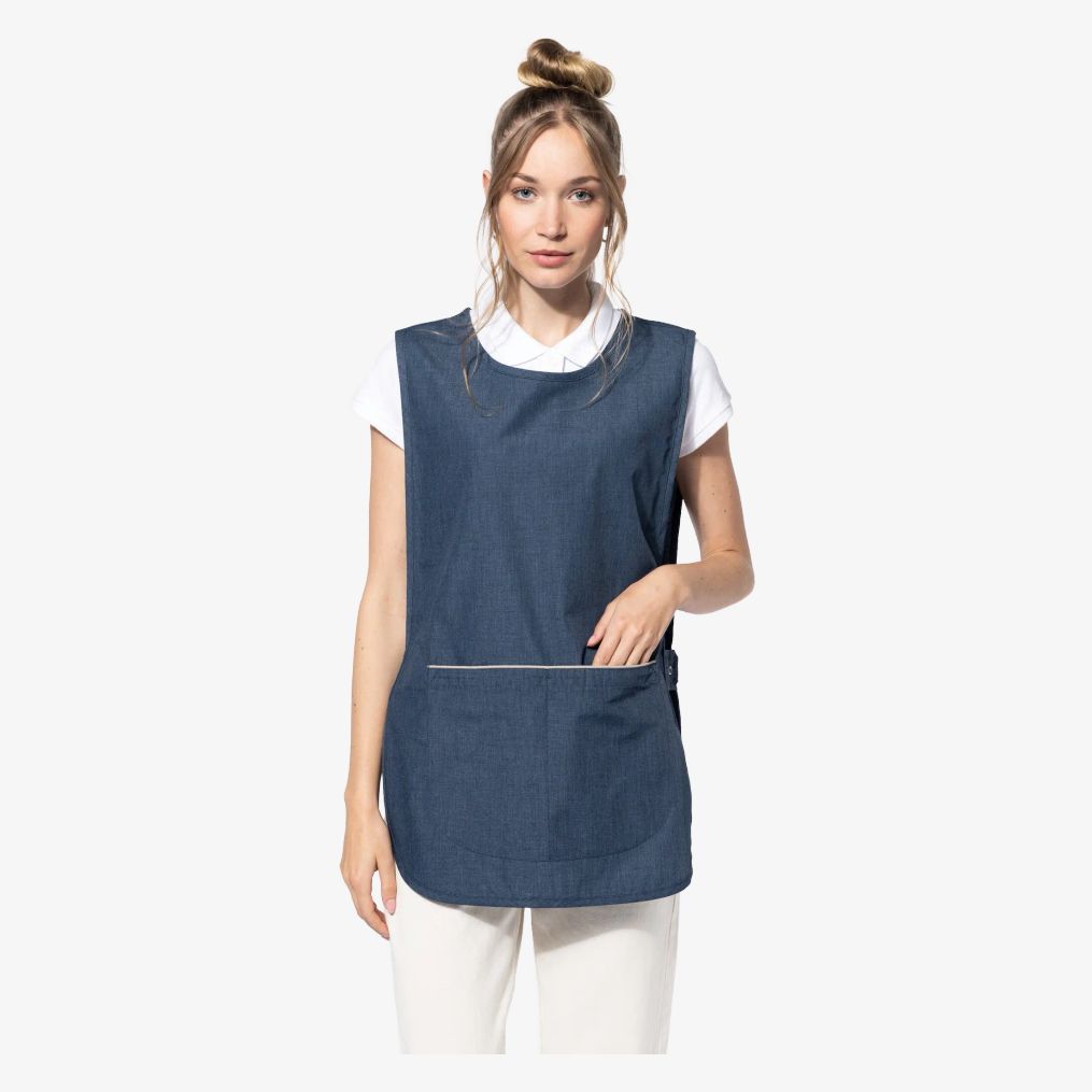 La tunique femme est conçue en tissu 65% polyester et 35% coton offrant une coupe confortable et une résistance adaptée à un usage fréquent.