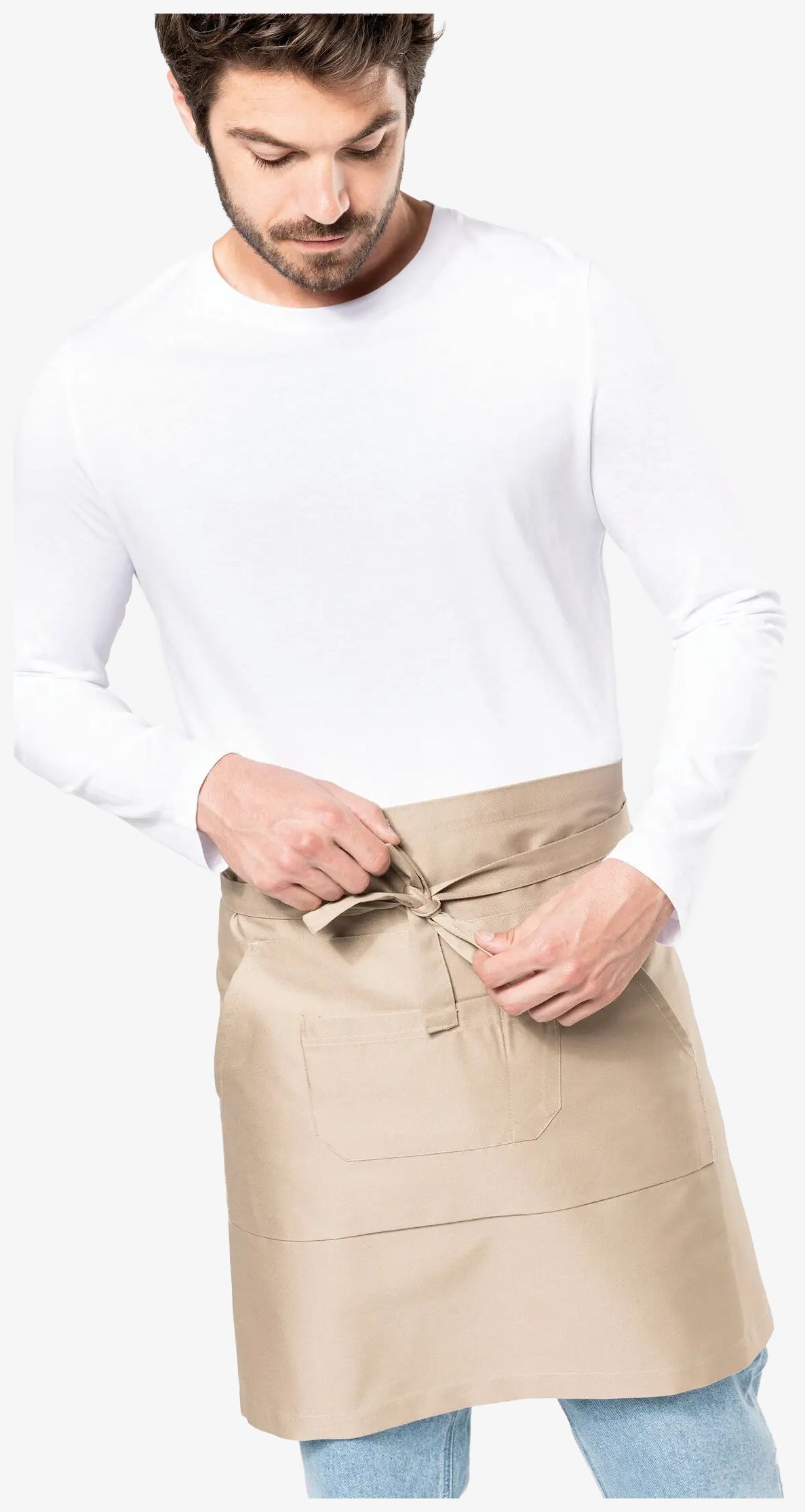 Le tablier polycoton mi-long est conçu en 65% polyester et 35% coton. Il comprend deux poches dont une kangourou et une divisée en deux compartiments. Les dimensions sont de 50 cm de hauteur et 90 cm de largeur. Le modèle Denim présente un traitement spécial avec un aspect vieilli et des variations de couleur entre les pièces.