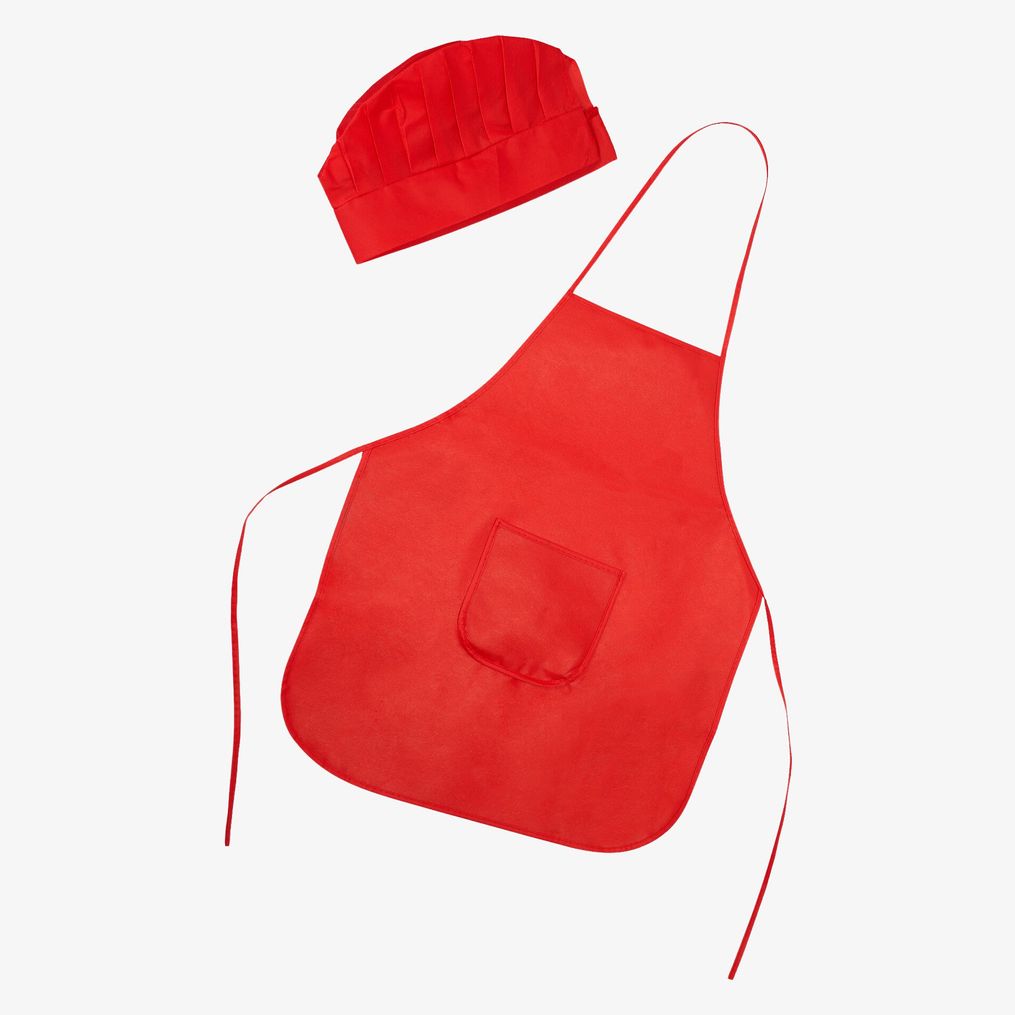 Le tablier non tissé JAMIE pour enfants est accompagné d'un bonnet assorti. Il comporte une fermeture par bande auto-agrippante sur le couvre-chef et une taille unique ajustable.