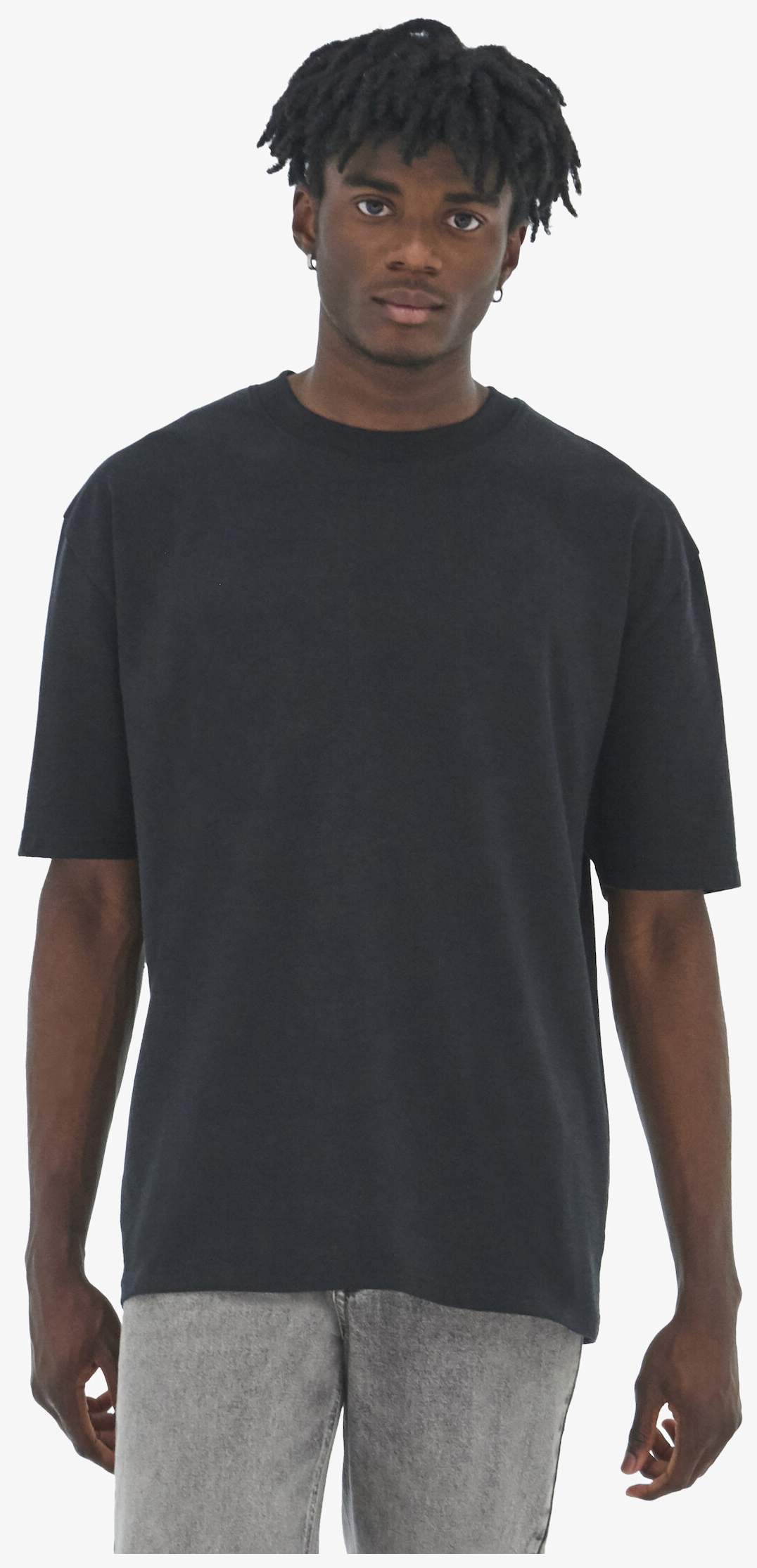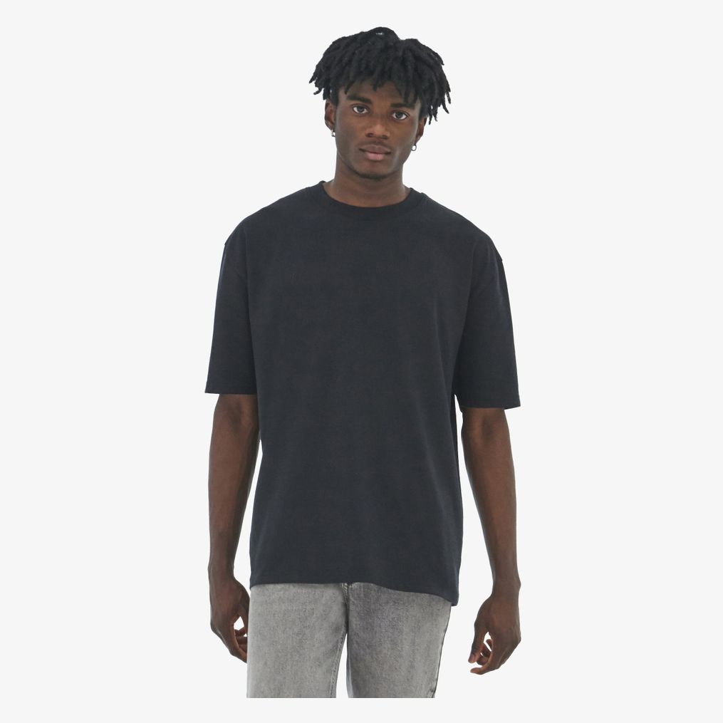 Le tee-shirt oversize en coton recyclé combine coton, polyester et élasthane recyclés pour une structure non tubulaire avec coutures latérales. Il présente un col rond renforcé, manches montées et ourlets avec couture à aiguille double.