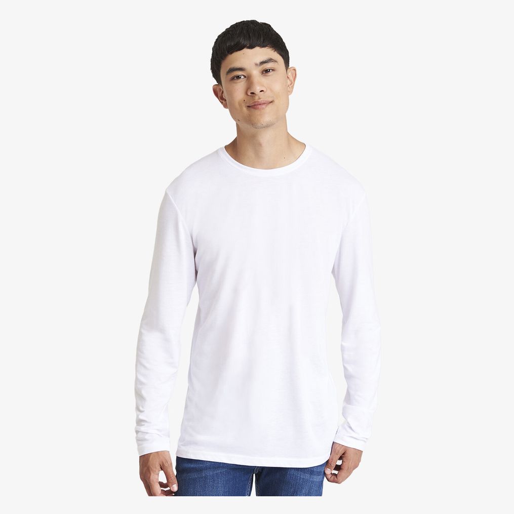 Le tee-shirt manches longues pour homme est conçu en mélange de trois tissus combinant polyester, viscose et coton. Il comprend un col rond côtelé, des coutures latérales et des manches montées. La couture est réalisée en double surpiqûres.