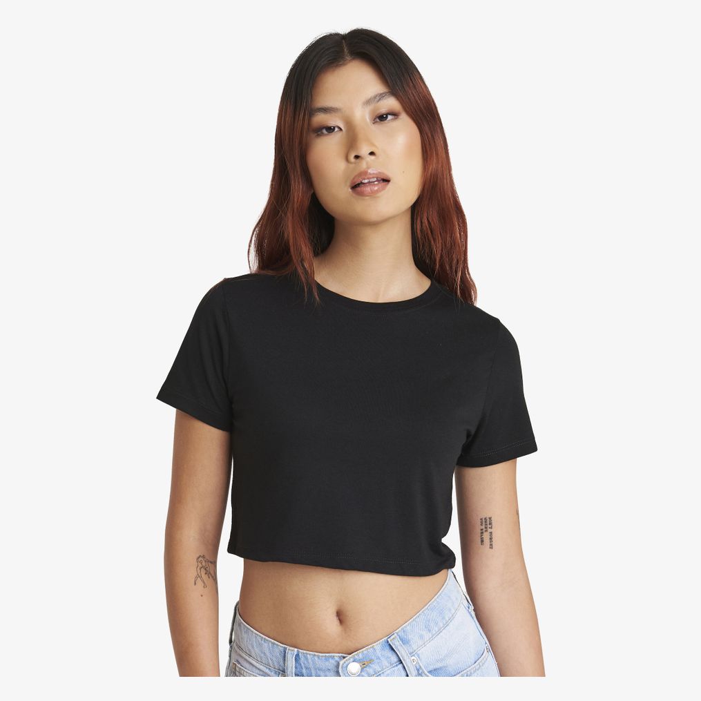 Le tee-shirt coupe courte Women's Tri-Blend Cropped T présente un col ras-du-cou et des manches courtes avec bord inférieur à surpiqûres doubles. Une bande recouvre l'arrière du col.