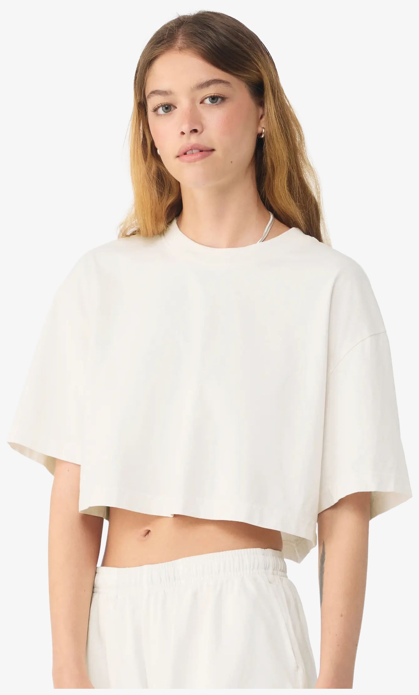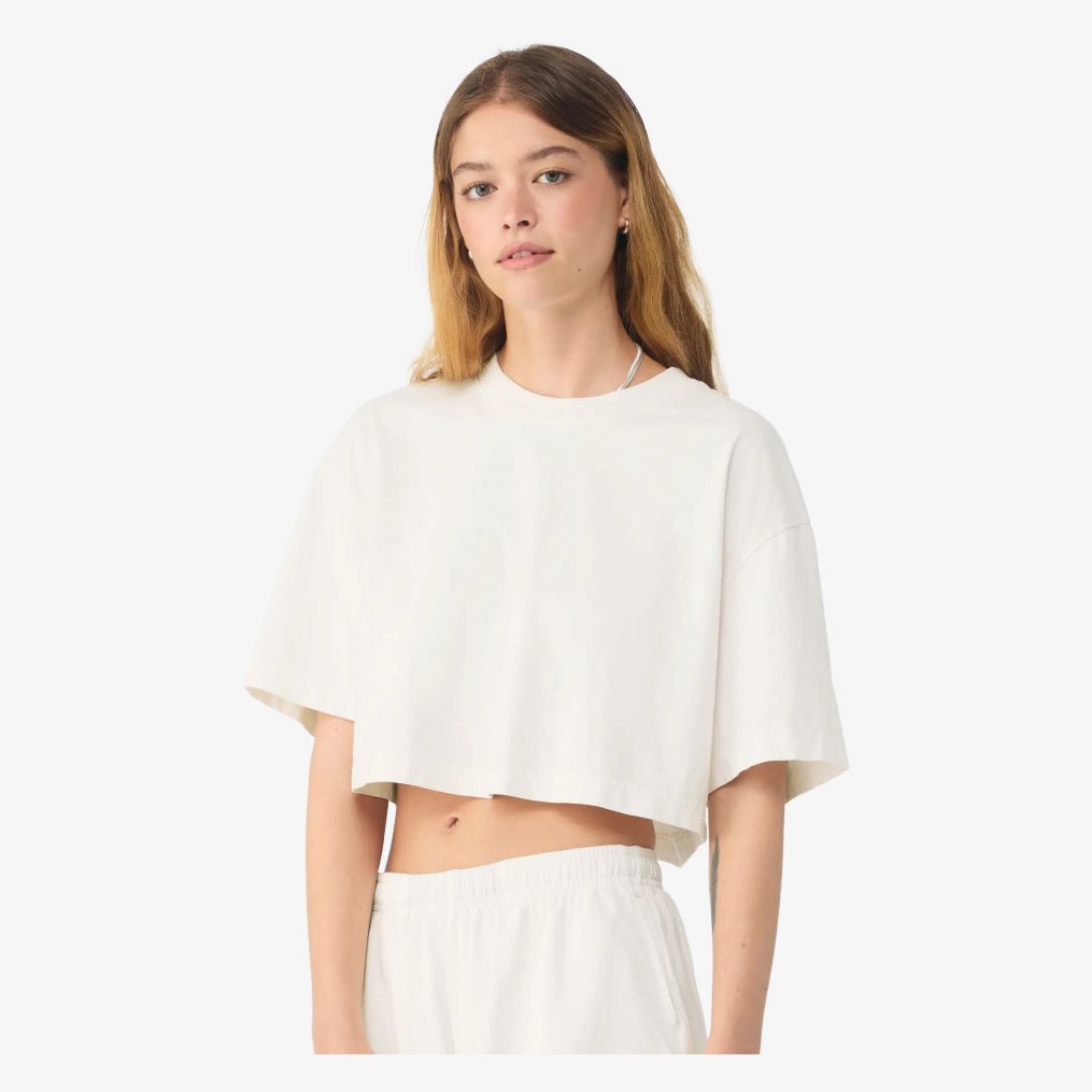 Le Cropped tee est un tee-shirt femme à coupe courte et carrée, avec manches oversize et coutures latérales. Sa construction en fil coton et son étiquette détachable conviennent à un usage quotidien.