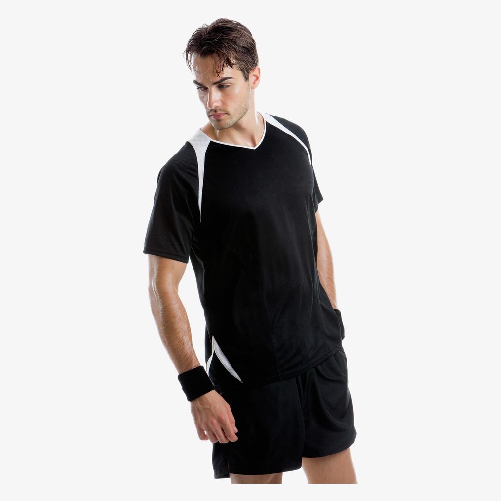 Dry wicking fabric keeping you cool and comfortable. Contrast binding around inner front neck with single needle top stitching, contrast inserts at shoulders and down front raglans, contrast curved inserts at hem front and back. Two curved side panels front and back with matching flatlocking, straight hem. Gamegear® woven label sewn in outer side seam. Fabric