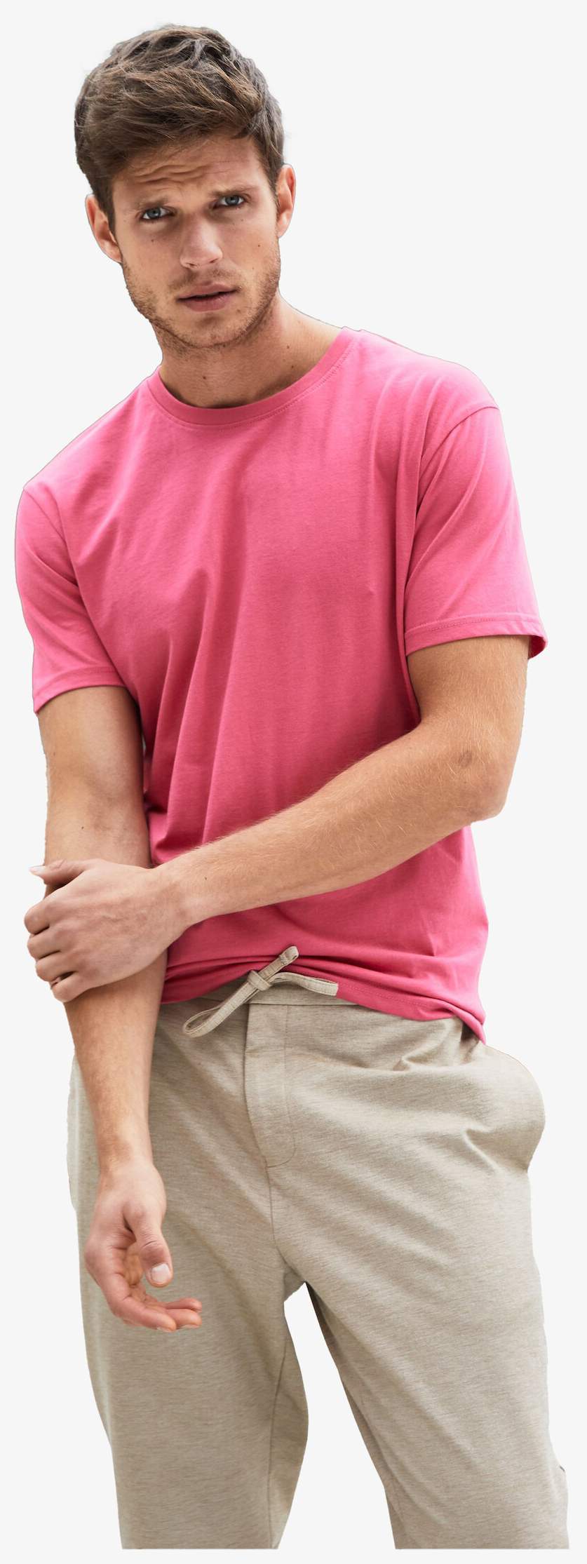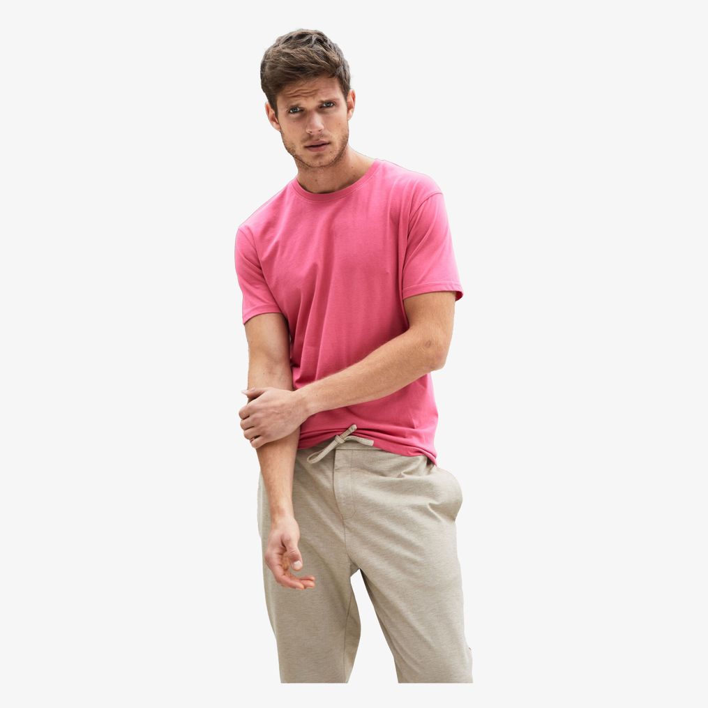 Le tee-shirt pour homme présente une forme classique avec un col ras du cou et des poignets intégrant de l'élasthanne. Il est fabriqué en jersey simple 100% coton biologique peigné filé à l'anneau. L'étiquette est détachable.