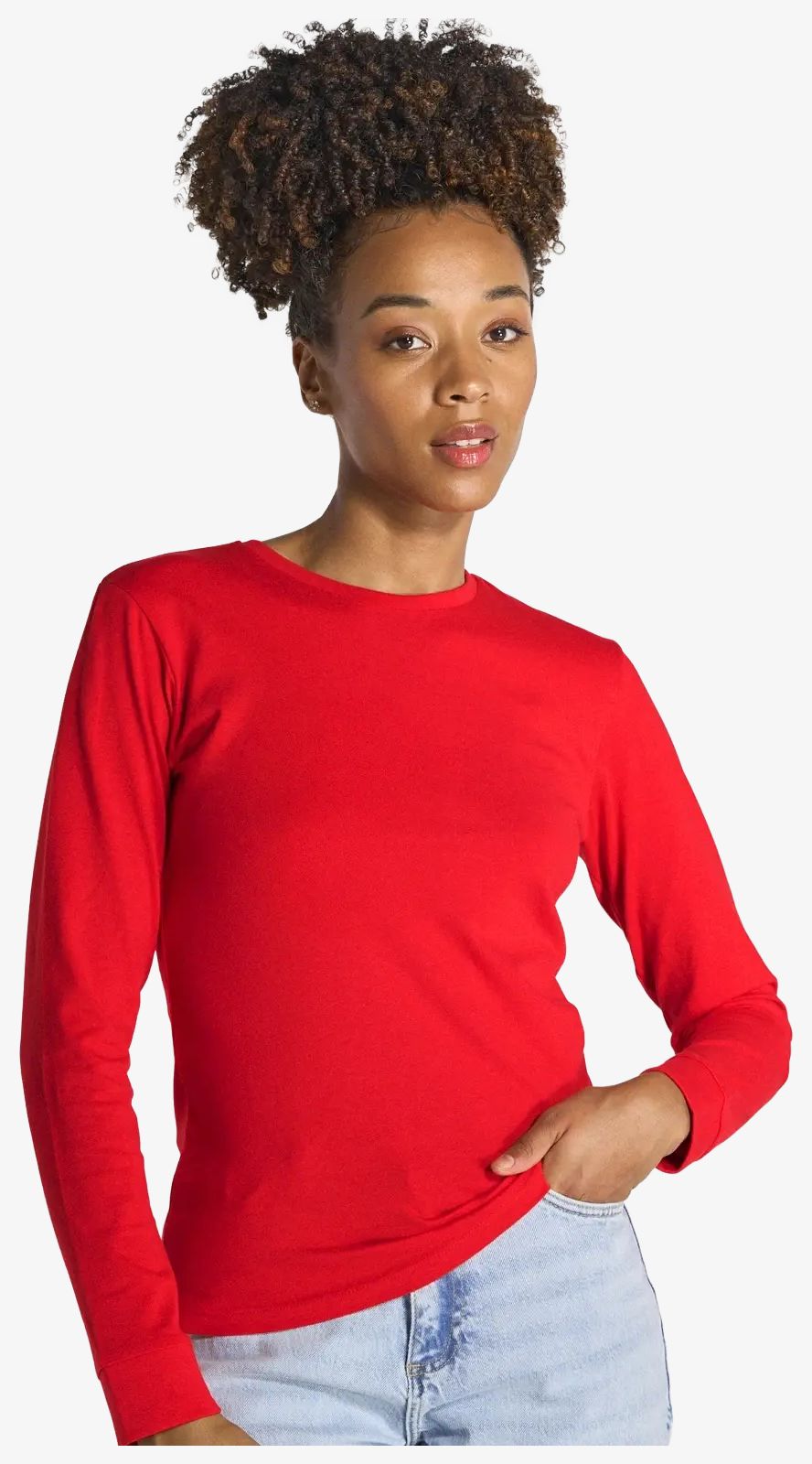 Tee-shirt femme manches longues. Coupe tubulaire. Double surpiqûre au cou, épaules taille. Col avec bord côte élasthanne. Étiquette détachable. Composition : 100% coton ringspun pré-rétréci (sauf coloris Grey Melange : 85% coton/15% viscose).