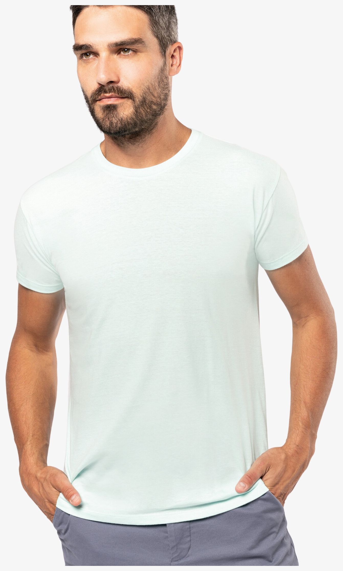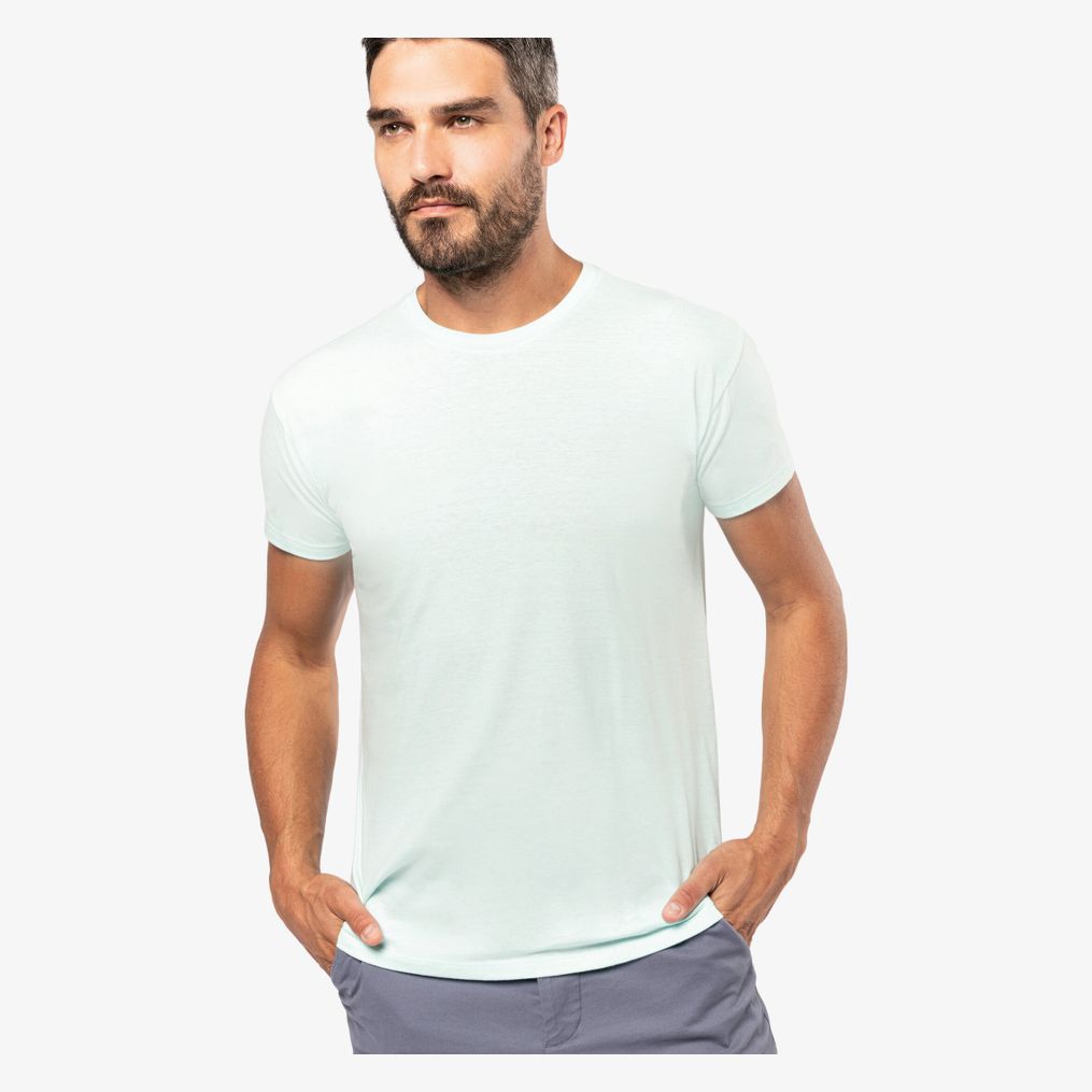 100% coton biologique - OCS100 certificat delivré par Ecocert Greenlife. (Ash Heather 98% coton biologique/ 2% viscose et Oxford Grey: 90% coton biologique/ 10% viscose OCS Blended certificat délivré par Ecocert Greenlife). Encolure ronde en bord-côte avec élasthanne. Bande de propreté ton sur ton à l'encolure. Tubulaire. Finition double aiguille bas de manches et bas de vêtement. Grammage : 140g/m²