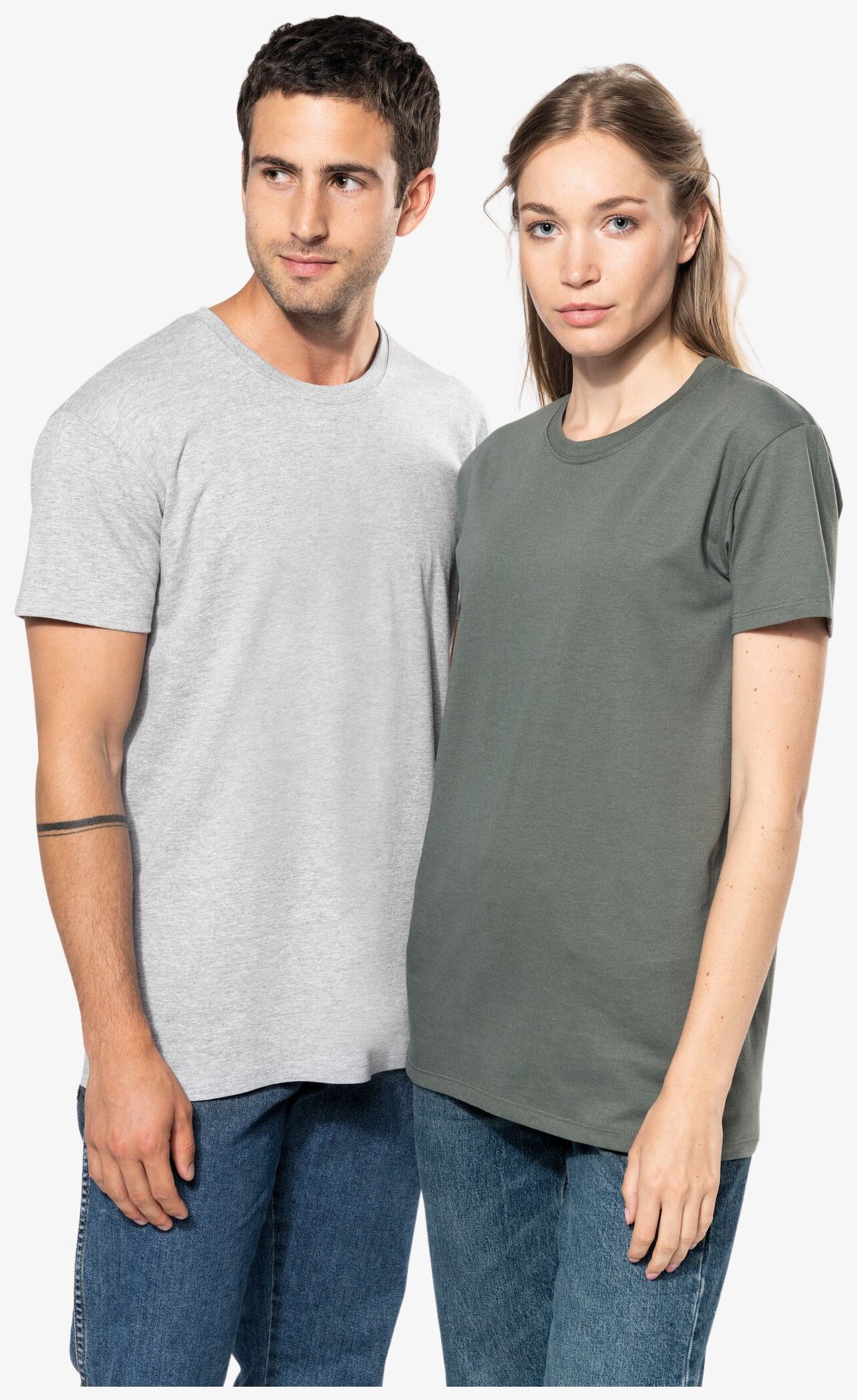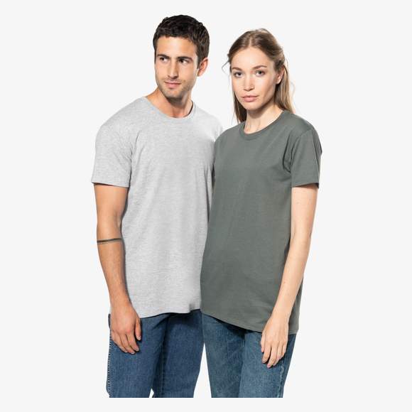T-shirt bio unisexe. Coupe tubulaire. Coupe droite. Encolure ronde en bord-côte avec double surpiqûres à cheval de la couture. Bande de propreté ton sur ton à l'encolure. Double aiguille au bas de manches et bas du vêtement. Pas d'étiquette de marque au col, uniquement une puce de taille pour faciliter la personnalisation. Tous les coloris sont conçus à partir de coton biologique. Les certificats OCS (Organic Content Standard) et OCS Blended sont délivrés par Ecocert Greenlife. Composition coloris unis : 100% coton. Coloris Oxford Grey : 90% coton / 10% viscose. Coloris Wine Heather, Green Marble Heather & Cloudy Blue Heather : 80% coton / 20 % polyester. Grammage : 185g/m²