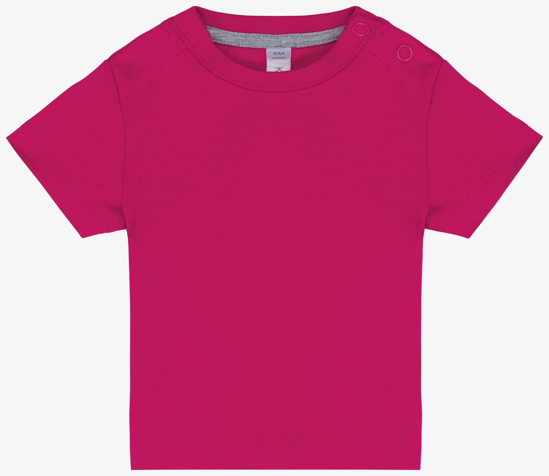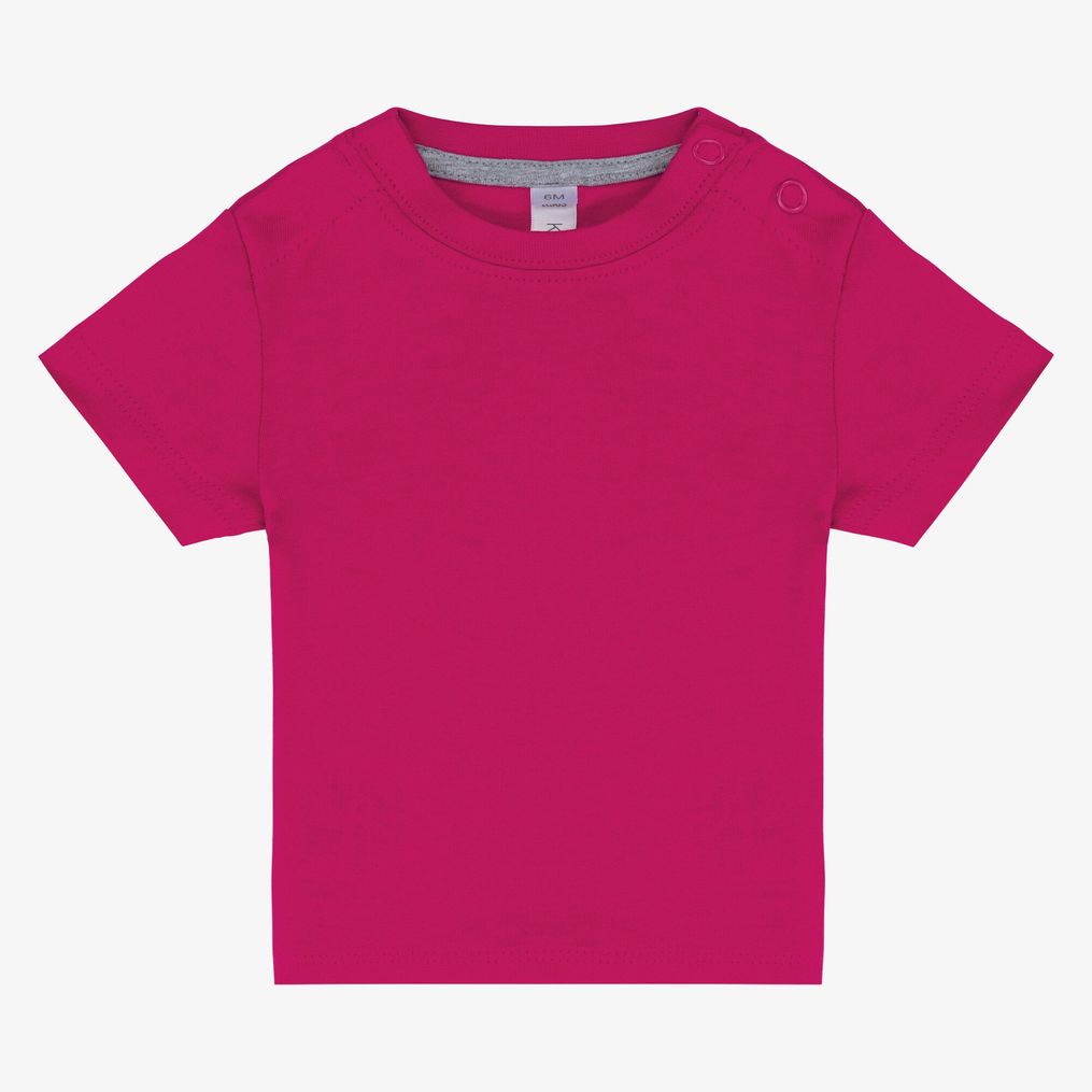 Le tee-shirt manches courtes bébé est conçu en 100% coton. Il possède une encolure ronde fermée par deux boutons pression sur l'épaule et une bande de propreté contrastée. La finition double aiguille est appliquée au bas des manches.