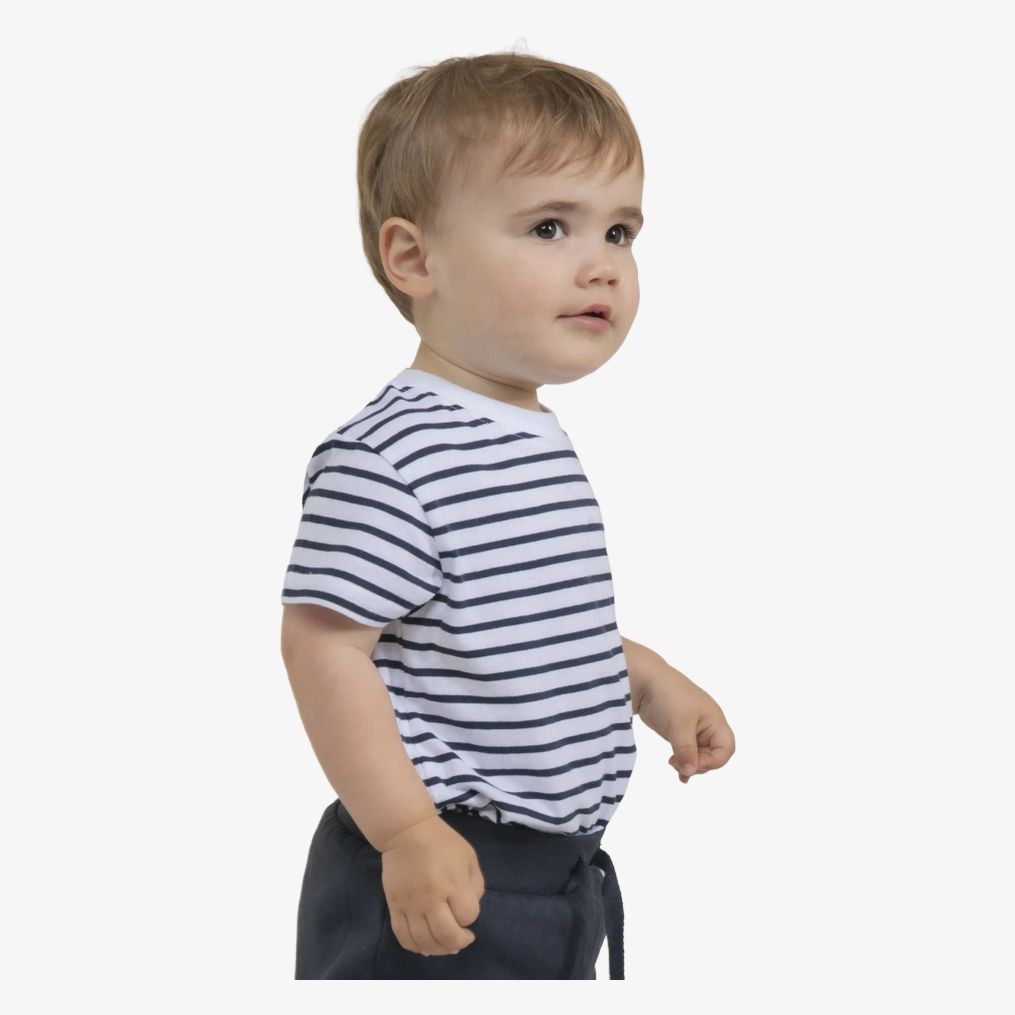 Le Kids t Shirt Rayé est un tee-shirt à rayures pour bébé avec manches droites et col blanc. Sa coupe simple convient à un usage quotidien. La finition par double couture au col, aux manches et en bas apporte une tenue régulière.