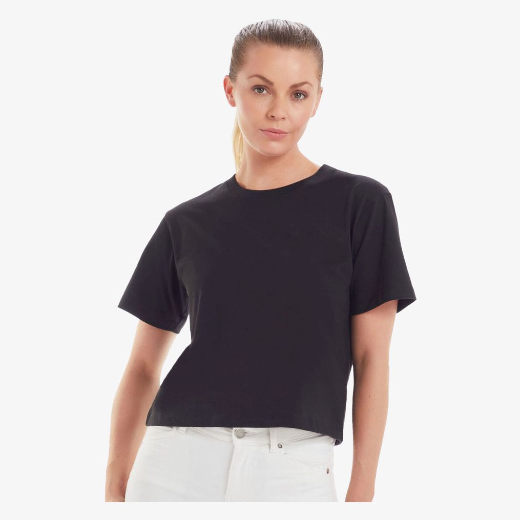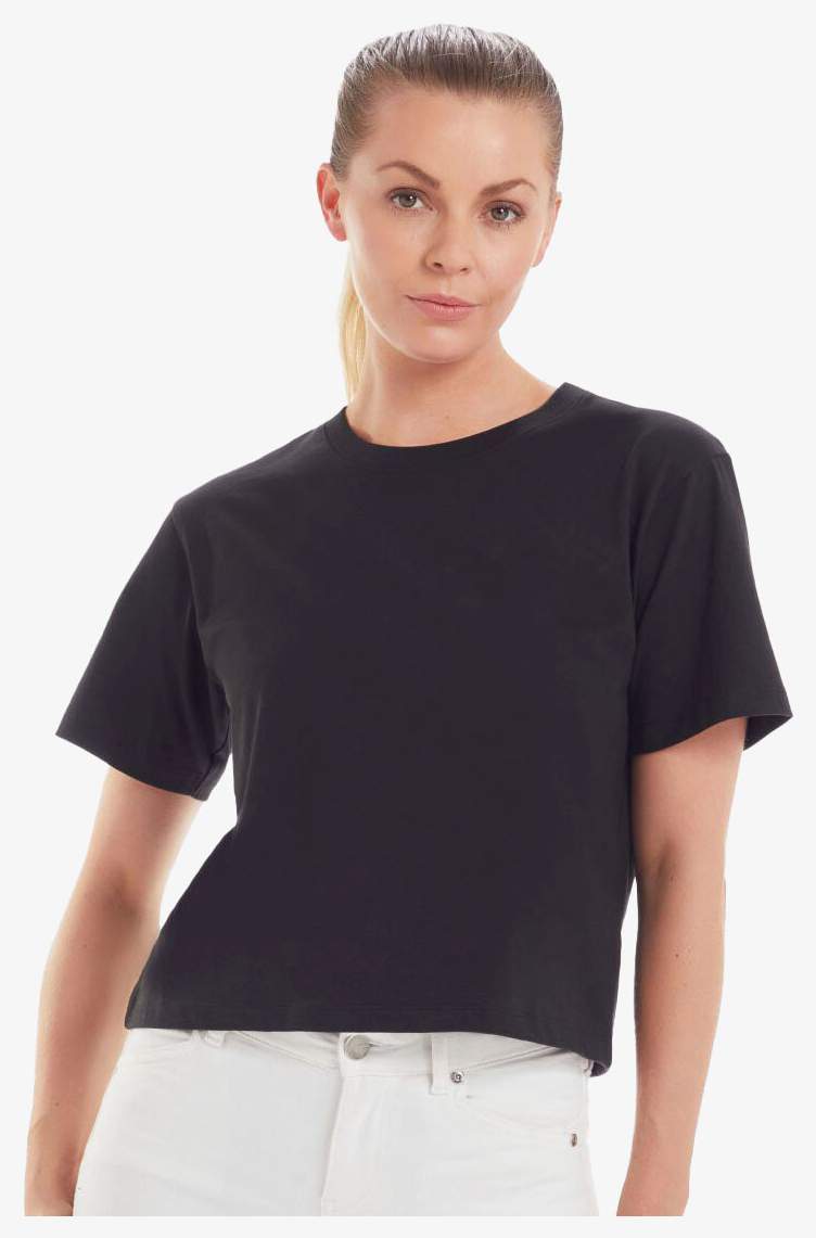 Le tee-shirt unicolore pour femme est réalisé en coton biologique ou conversion avec un jersey simple et un tissu épais doux. Il présente un col rond, une coupe plus courte et une coupe ample. L'étiquette dans le cou est détachable et l'étiquette d'entretien comporte un QR-code pour vérifier la chaîne d'approvisionnement et l'impact du tissu bio.