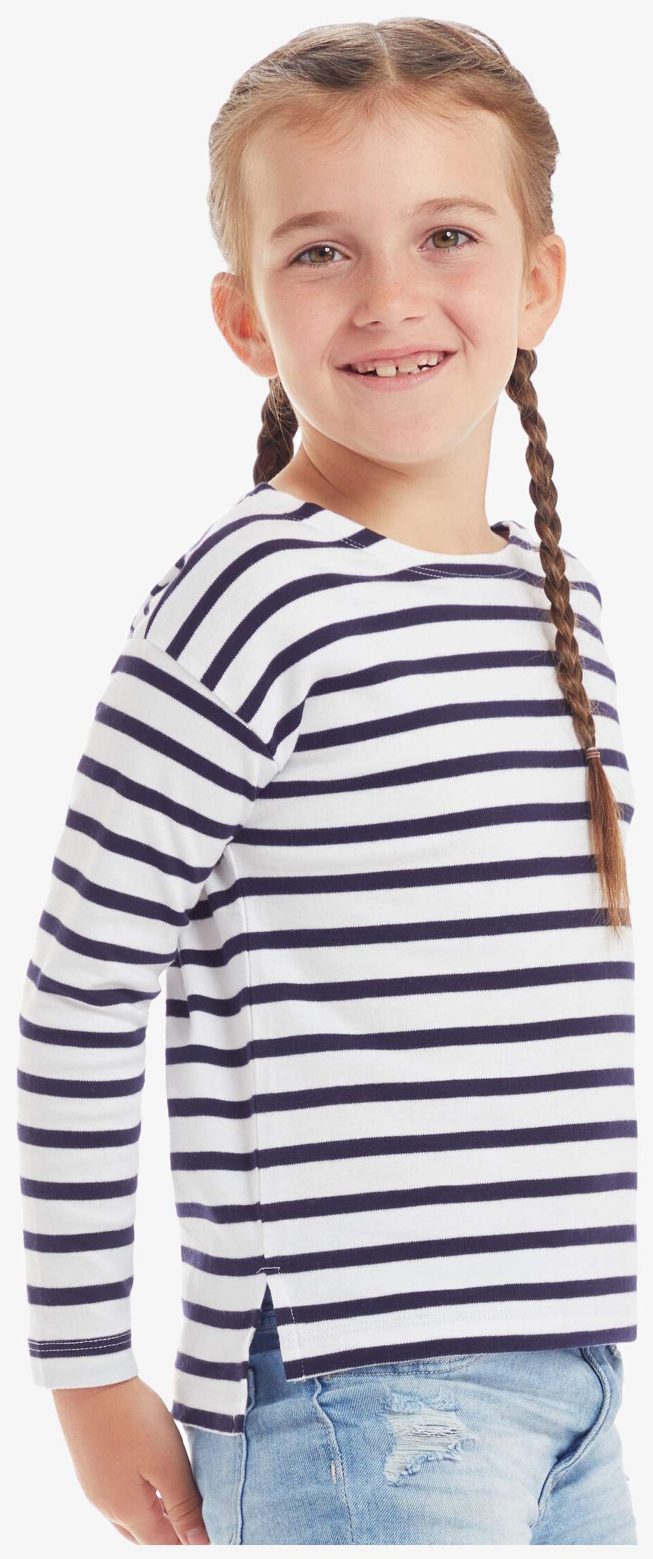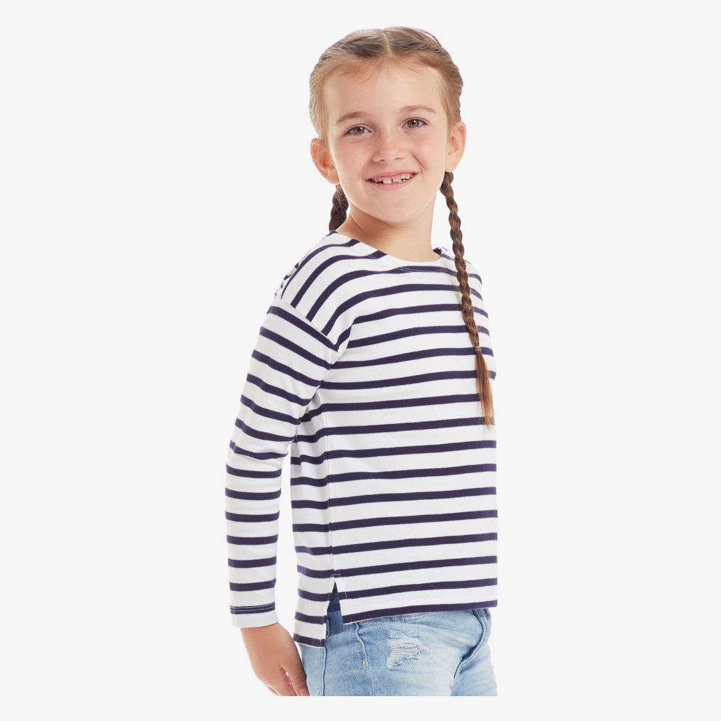 Le tee-shirt coton bio à manches longues pour enfant comprend des rayures de 8 mm en fil teint. Il dispose d'un col rond, de fentes latérales et d'un dos plus long. Le tissu est doux et extensible, avec une étiquette détachable.