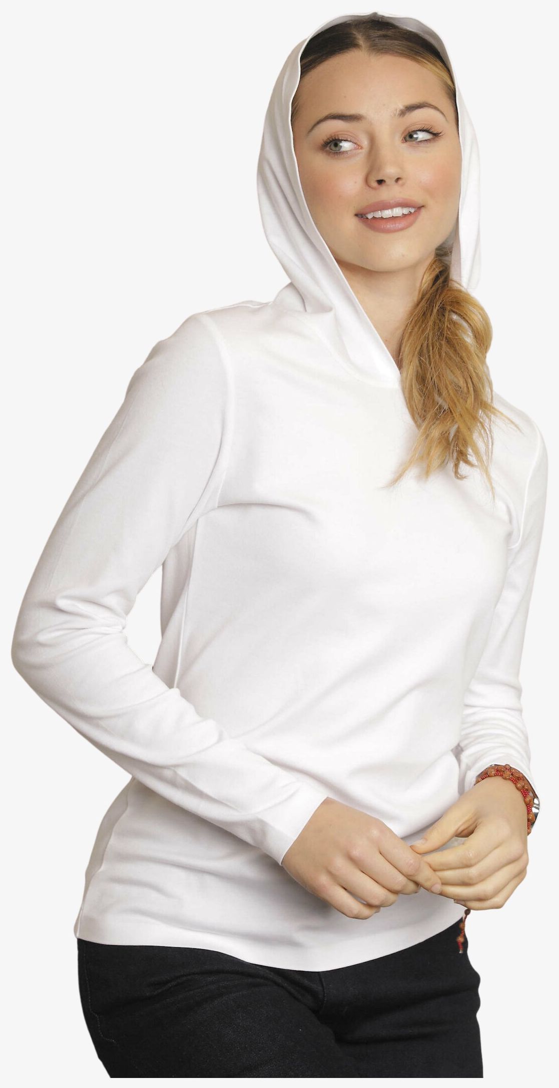 Tee-shirt avec capuche pour femme. Modèle à manches longues avec capuche. Matière interlock composée de 96,5% de coton et de 3,5% d'élasthanne. Grammage : 240g/m²