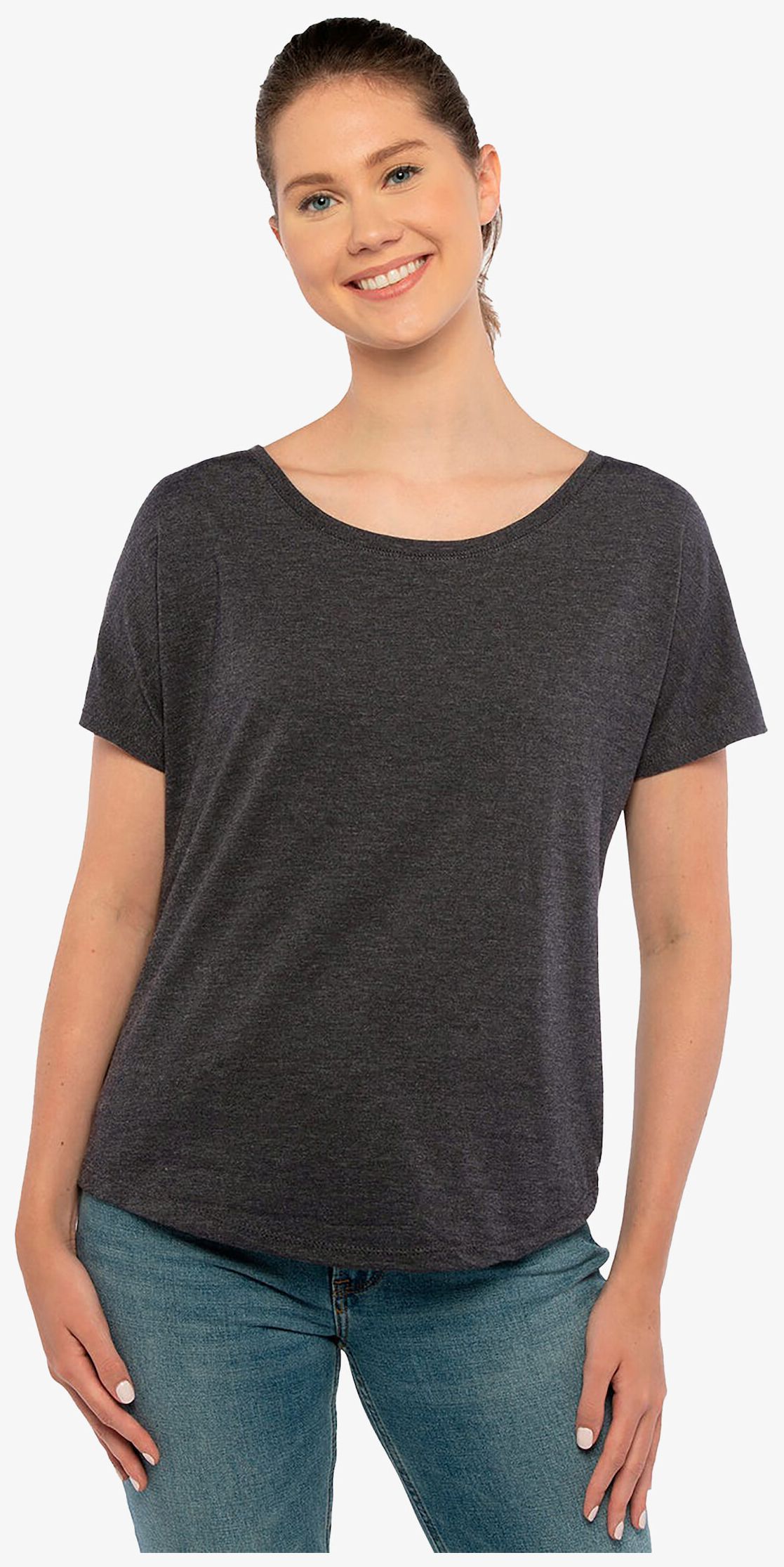 Tee-shirt détente pour femme en tissu mélangé. Encolure plus large. Col monté avec côte 1x1 tri-blend avec surpiqûres. Étiquette satinée. Jersey triblend. Composition : 50% polyester, 25% coton peigné ring-spun, 25% viscose. Grammage : 145g/m²