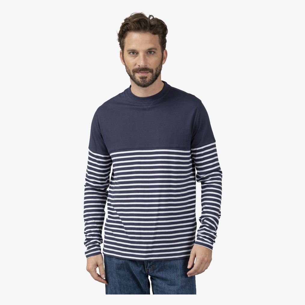 Le tee-shirt manches longues Marin Long Sleeves est une marinière avec manches droites. Les rayures débutent à 20 cm du col. Le col intègre de l'élasthanne. Les coutures comprennent des côtés latéraux et un triangle sous le col.