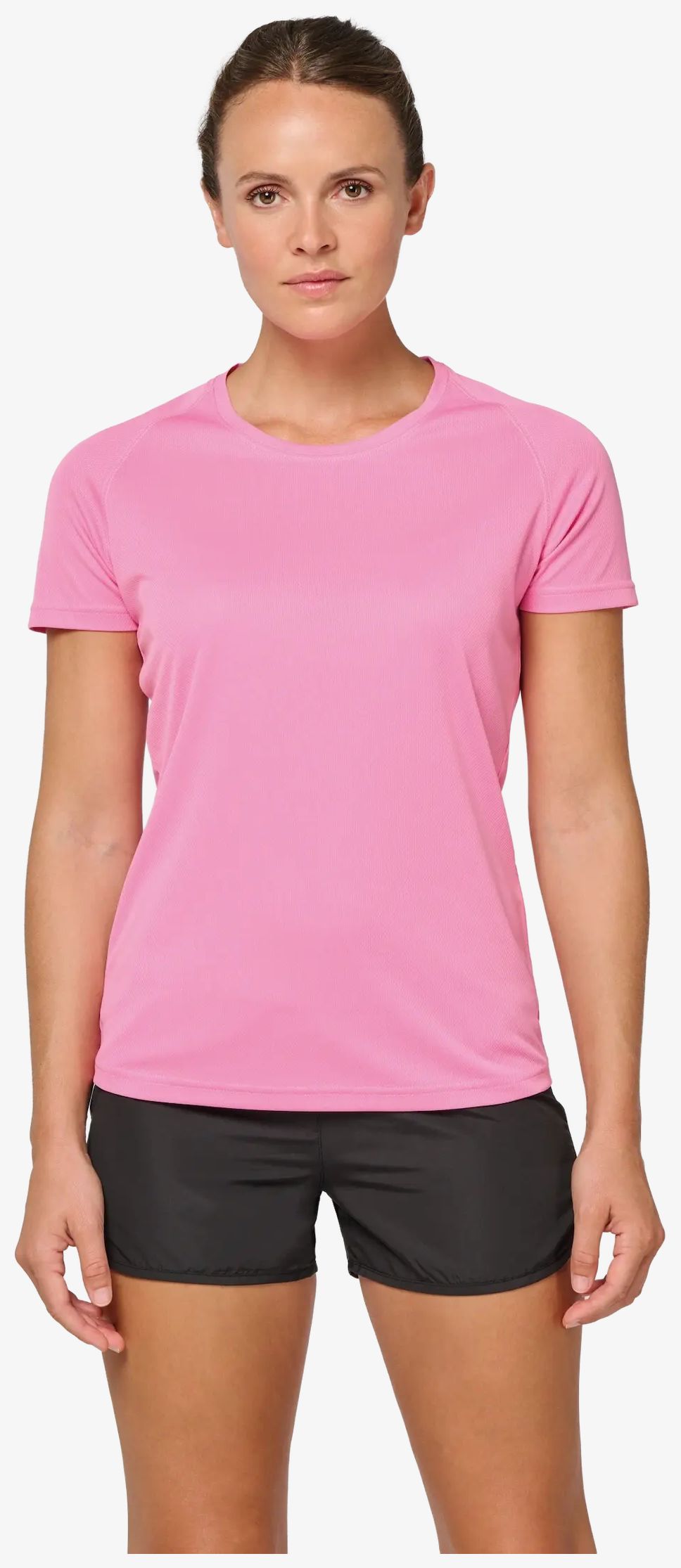 Le tee-shirt sport à col rond recyclé femme est conçu en tissu léger à séchage rapide avec une coupe droite et une encolure ronde dotée d'une bande propreté contrastée. Les manches raglan présentent des surpiqûres ton sur ton. La finition comprend des coutures double aiguilles à l'encolure, au bas des manches et un ourlet tubulaire.